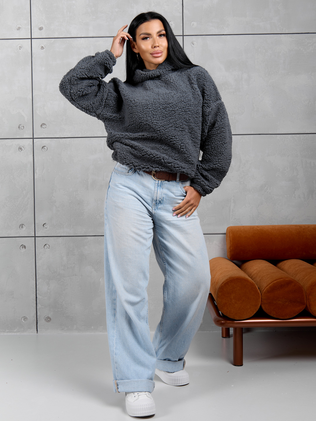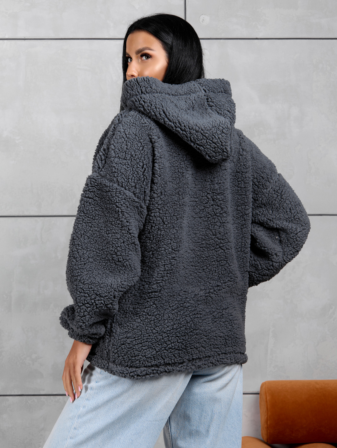 Толстовка оверсайз станет прекрасным подарком на любой праздник! Шерпа – синтетическое полотно с имитацией меха на лицевой поверхности. На ощупь материал плотный, приятный, мягкий. Хорошо согревает. Изнаночная сторона – текстильное полотно трикотажного переплетения. Фактура ткани хорошо видна на фото. Идеально подойдет для прохладного времени года. Толстовка идеально сочетается с любыми вещами в гардеробе с джинсами, юбкой, можно надеть поверх платья холодным вечером. Она непременно понравится взрослым женщинам и девочкам - подросткам.