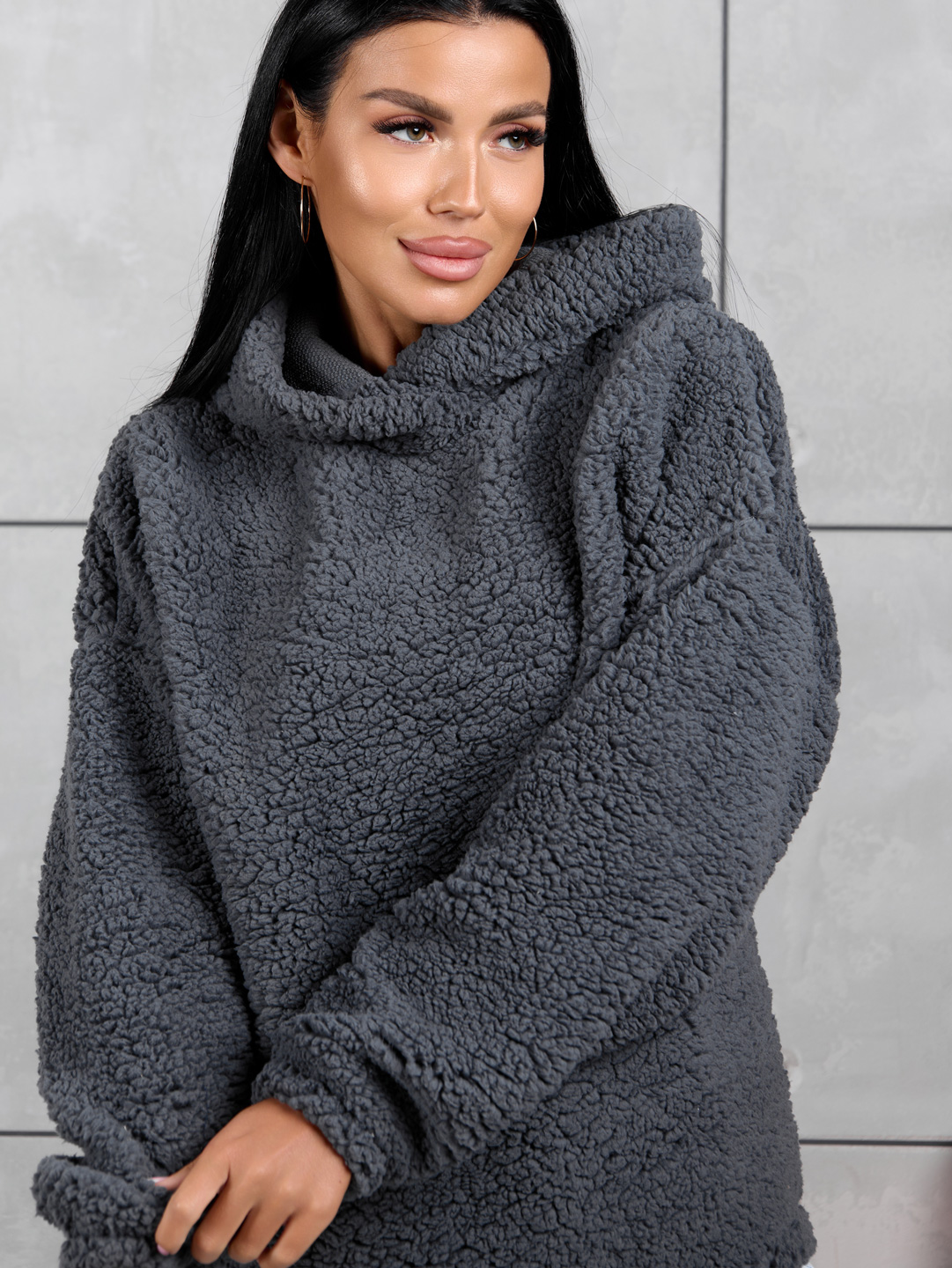 Толстовка оверсайз станет прекрасным подарком на любой праздник! Шерпа – синтетическое полотно с имитацией меха на лицевой поверхности. На ощупь материал плотный, приятный, мягкий. Хорошо согревает. Изнаночная сторона – текстильное полотно трикотажного переплетения. Фактура ткани хорошо видна на фото. Идеально подойдет для прохладного времени года. Толстовка идеально сочетается с любыми вещами в гардеробе с джинсами, юбкой, можно надеть поверх платья холодным вечером. Она непременно понравится взрослым женщинам и девочкам - подросткам.