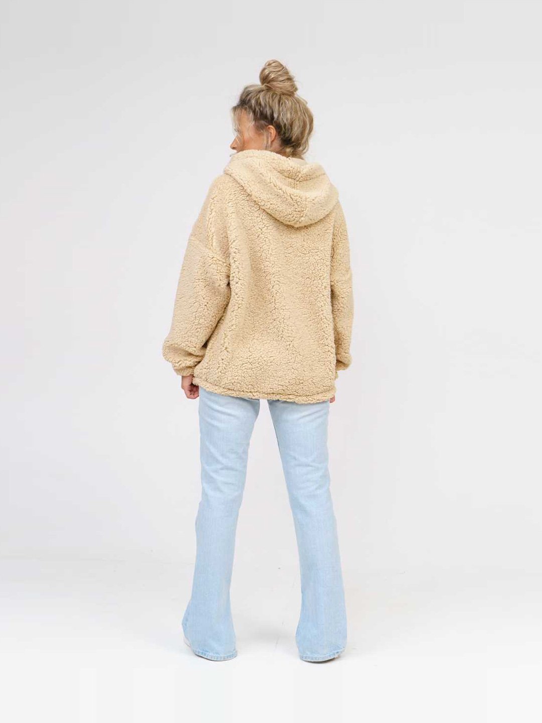 Толстовка оверсайз станет прекрасным подарком на любой праздник! Шерпа – синтетическое полотно с имитацией меха на лицевой поверхности. На ощупь материал плотный, приятный, мягкий. Хорошо согревает. Изнаночная сторона – текстильное полотно трикотажного переплетения. Фактура ткани хорошо видна на фото. Идеально подойдет для прохладного времени года. Толстовка идеально сочетается с любыми вещами в гардеробе с джинсами, юбкой, можно надеть поверх платья холодным вечером. Она непременно понравится взрослым женщинам и девочкам - подросткам.
