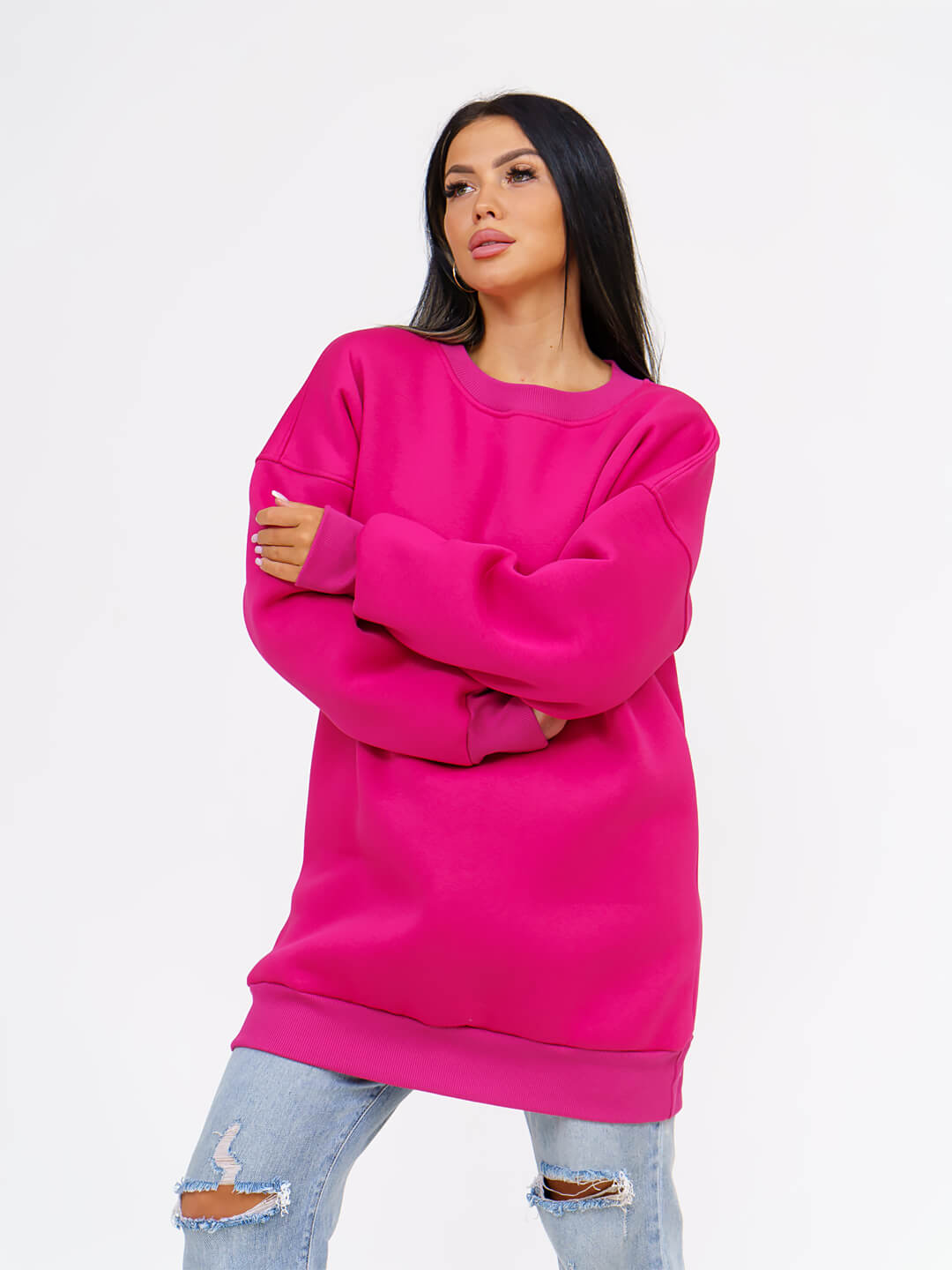 Толстовка женская оверсайз выполнена из качественного хлопкового трикотажа с начесом (футер 3-х нитка с начесом). который не деформируется при стирке и во время носки, благодаря этому материалу однотонный свиншот утепленный будет радовать вас своим видом и дарить приятные тактильные ощущения не один сезон. Стильная базовая толстовка подчеркнет достоинства фигуры. Теплая и уютная вещь в спортивном стиле заменит вам худи с начесом из флиса и школьную кофту, пуловер и толстовку с капюшоном, свитер и джемпер. Удлиненная толстовка свободного кроя деликатно скроет несовершенства полной фигуры. Объемная модель с длинным рукавом на манжете и округлым вырезом горловины удобна в повседневной носке: она не сковывает телодвижения, отлично комбинируется с одеждой разных стилей и фасонов, цветов и фактур.