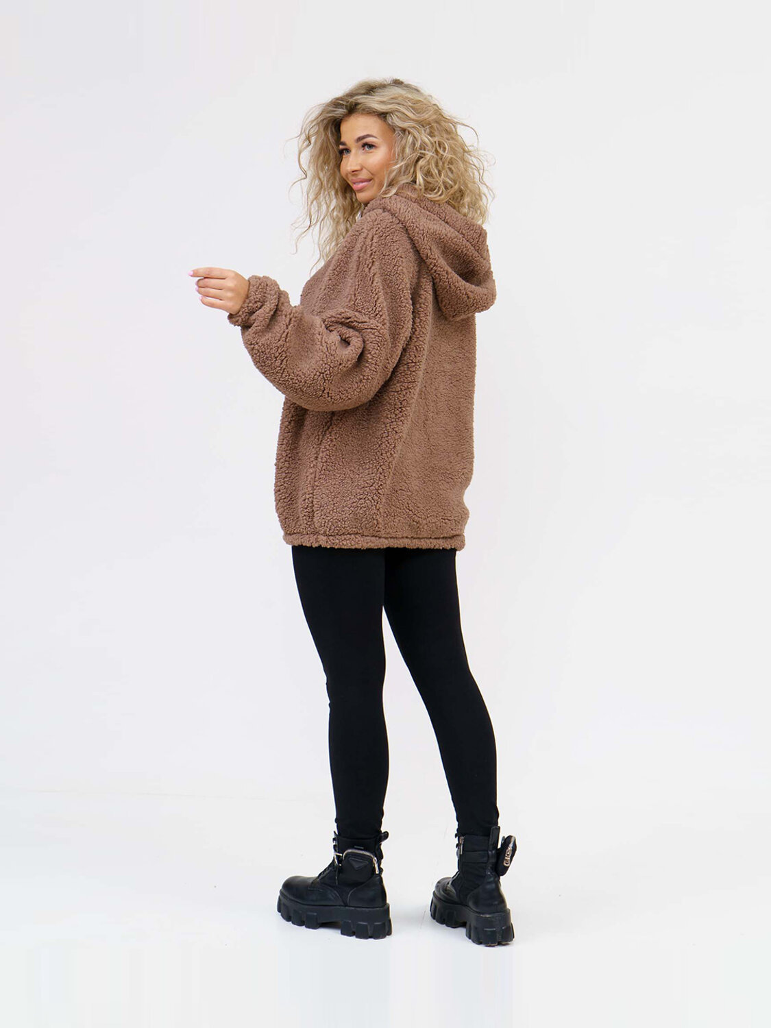 Толстовка оверсайз станет прекрасным подарком на любой праздник! Шерпа – синтетическое полотно с имитацией меха на лицевой поверхности. На ощупь материал плотный, приятный, мягкий. Хорошо согревает. Изнаночная сторона – текстильное полотно трикотажного переплетения. Фактура ткани хорошо видна на фото. Идеально подойдет для прохладного времени года. Толстовка идеально сочетается с любыми вещами в гардеробе с джинсами, юбкой, можно надеть поверх платья холодным вечером. Она непременно понравится взрослым женщинам и девочкам - подросткам.