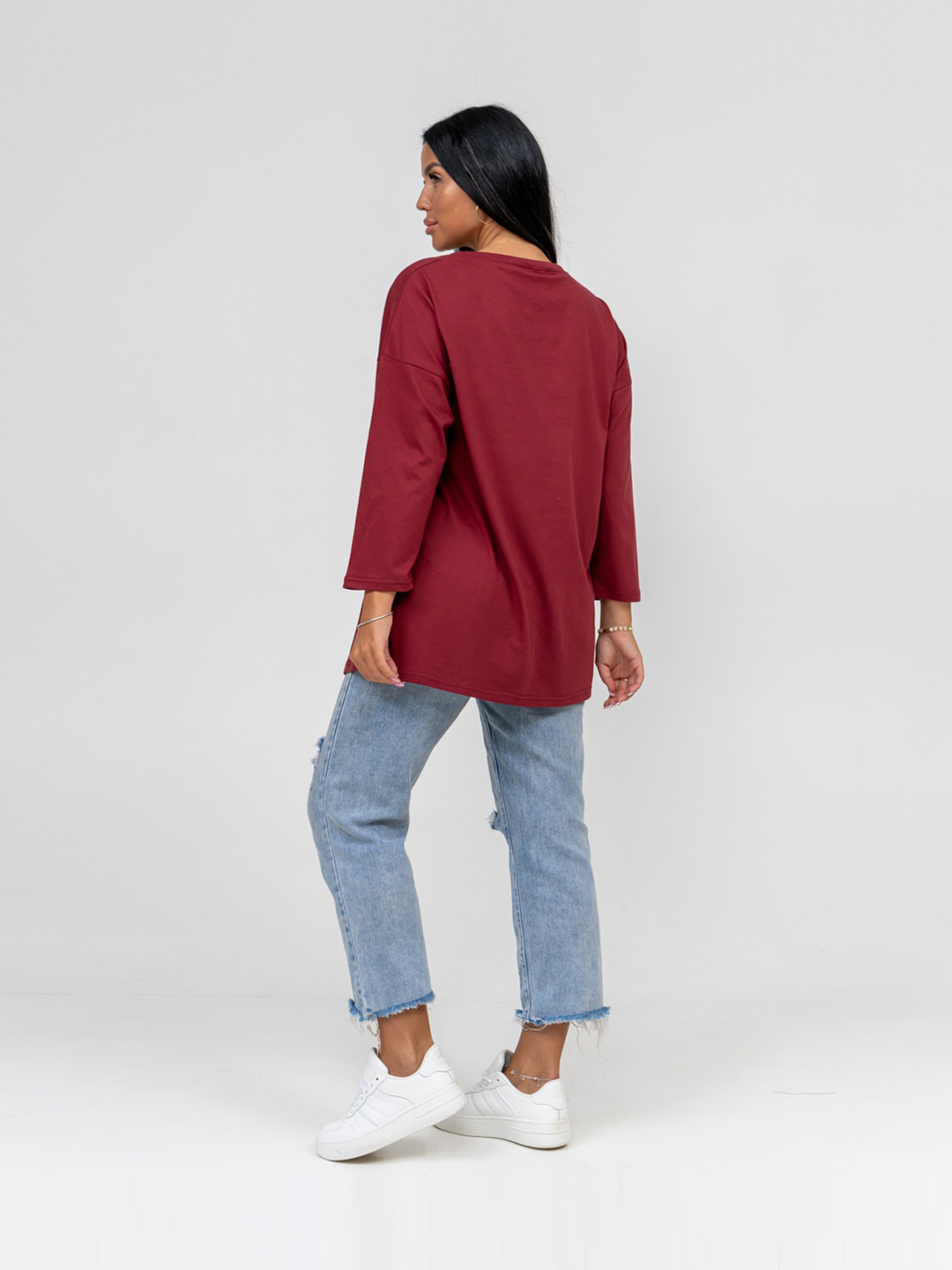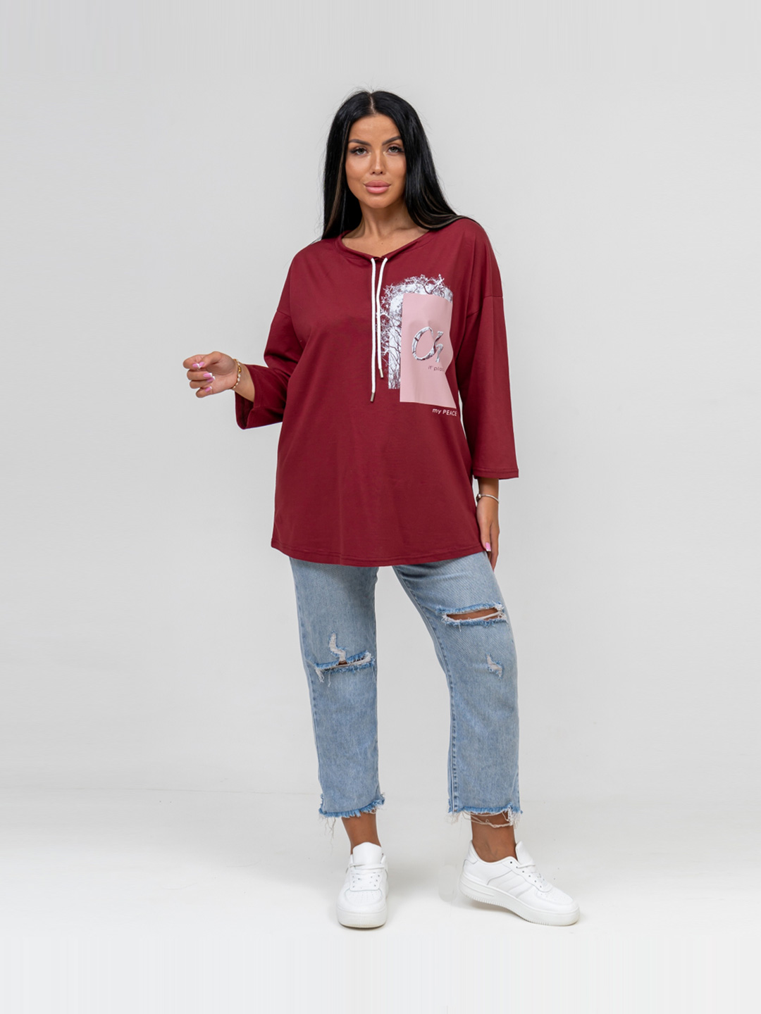 Туника женская, свободного силуэта, длиной чуть ниже уровня бедер, выполненная из качественного трикотажного полотна - кулирка. Вырез горловины V - образный, с регулировкой на шнурке. Рукав - спущенный, длиной 3/4. На передней части стильный принт. Удобная и практичная модель, на каждый день.