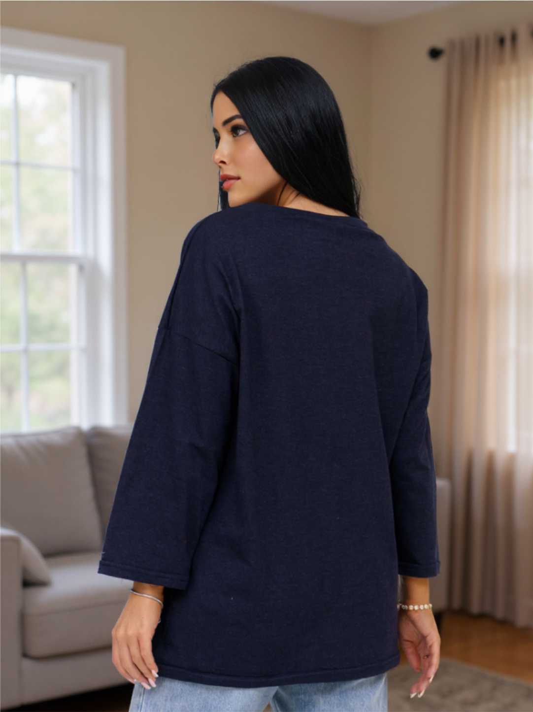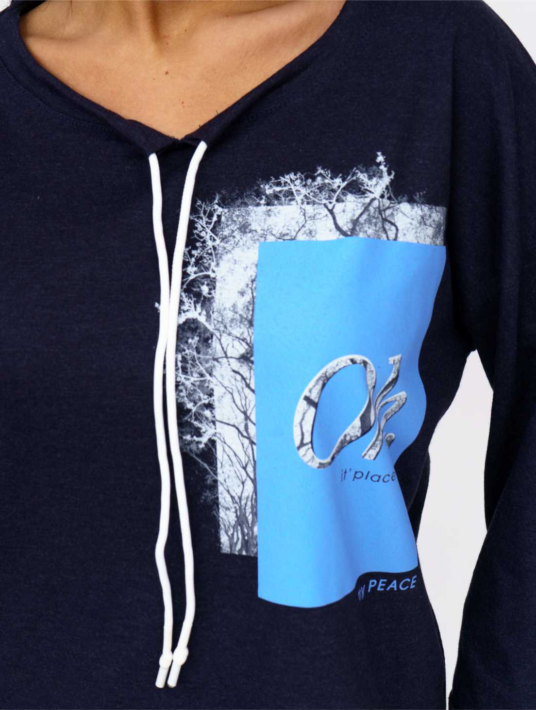 Туника женская, свободного силуэта, длиной чуть ниже уровня бедер, выполненная из качественного трикотажного полотна - кулирка. Вырез горловины V - образный, с регулировкой на шнурке. Рукав - спущенный, длиной 3/4. На передней части стильный принт. Удобная и практичная модель, на каждый день.