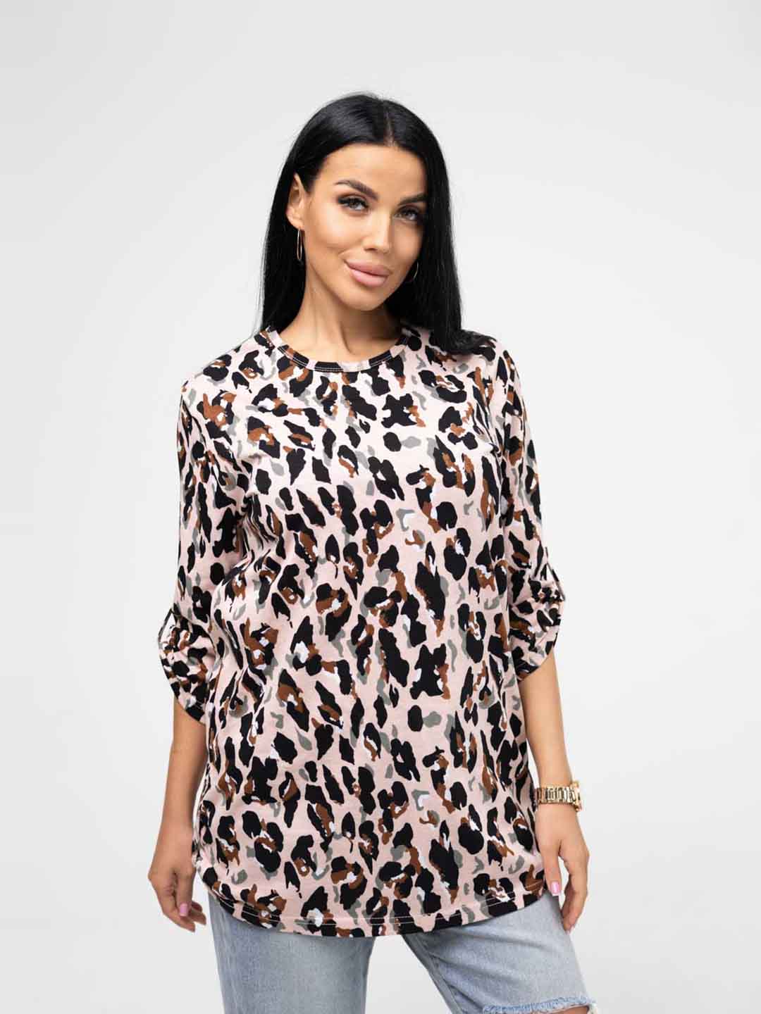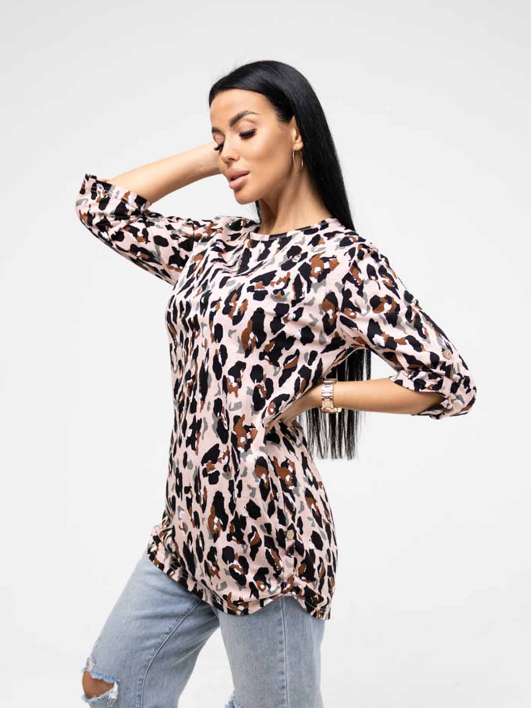Туника женская полуприлегающего силуэта длинной чуть ниже уровня бёдер. Туника с декоративными патами по рукаву и боковым швам скроет недостатки фигуры и подчеркнет её достоинства. Длинна рукава 3/4 прекрасно подойдет на любой сезон. В нашей модели вы будете прекрасно выглядеть в офисе, дома, на спорте, прогулках, отдыхе (на пляже у моря).