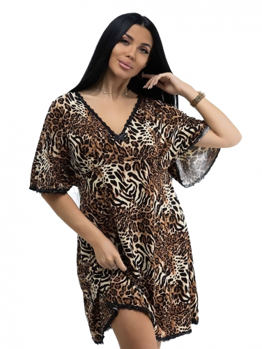 Туника женская из мягкого, приятного к телу трикотажа. Длина изделия до уровня колена. Рукав - спущенный, короткий. Вырез горловины V-образный. Нижняя часть домашнего платья, рукава и горловина имеют отделку кружевом.
