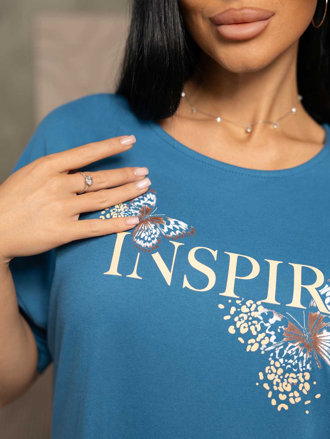 Туника женская из мягкого, приятного к телу трикотажного полотна, длиной выше уровня колена. Домашнее платье имеет округлый вырез и стильный спущенный рукав. В боковых швах удобные вырезы. На полочке и спине красивый печатный рисунок.