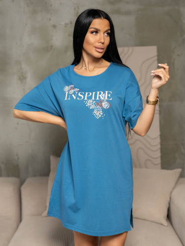 Туника женская из мягкого, приятного к телу трикотажного полотна, длиной выше уровня колена. Домашнее платье имеет округлый вырез и стильный спущенный рукав. В боковых швах удобные вырезы. На полочке и спине красивый печатный рисунок.