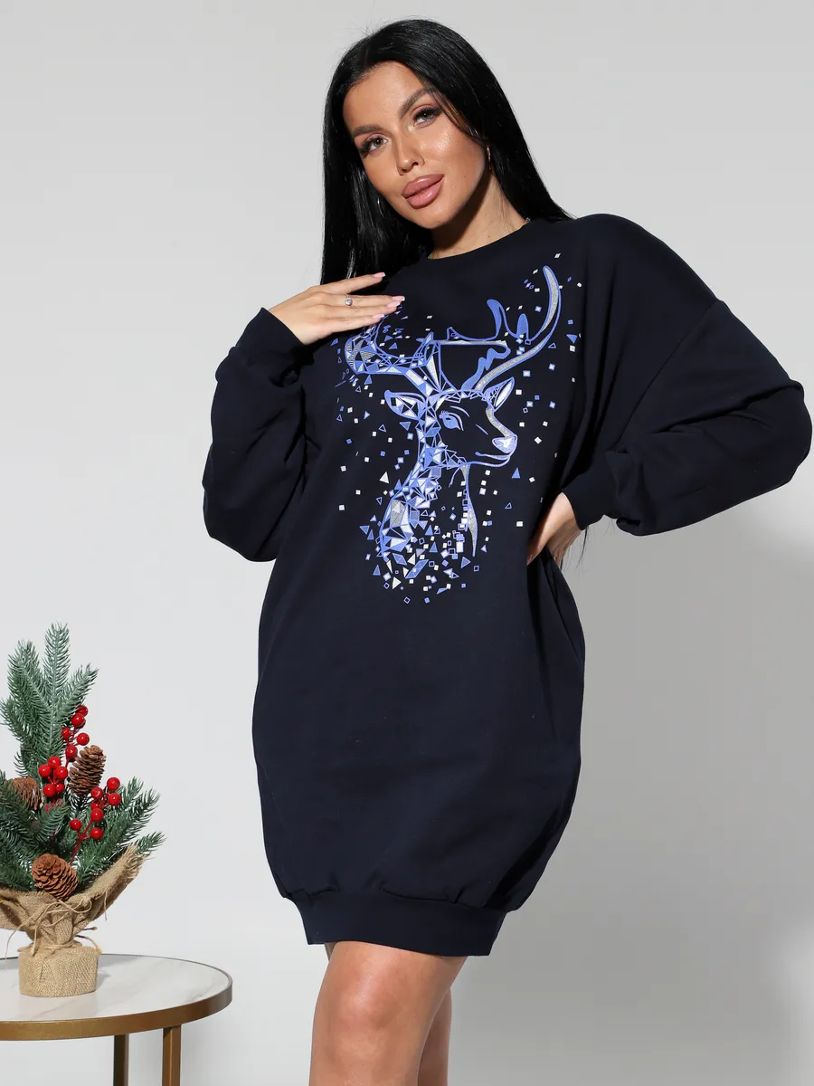 Женское платье толстовка из качественного турецкого футера с принтом-блестками. Платье имеет О-образную горловину и широкой обтачкой из кашкорсе, спущенное плечо с манжетой по рукаву, карманы в боковых швах и небольшие разрезы по низу изделия спереди.
