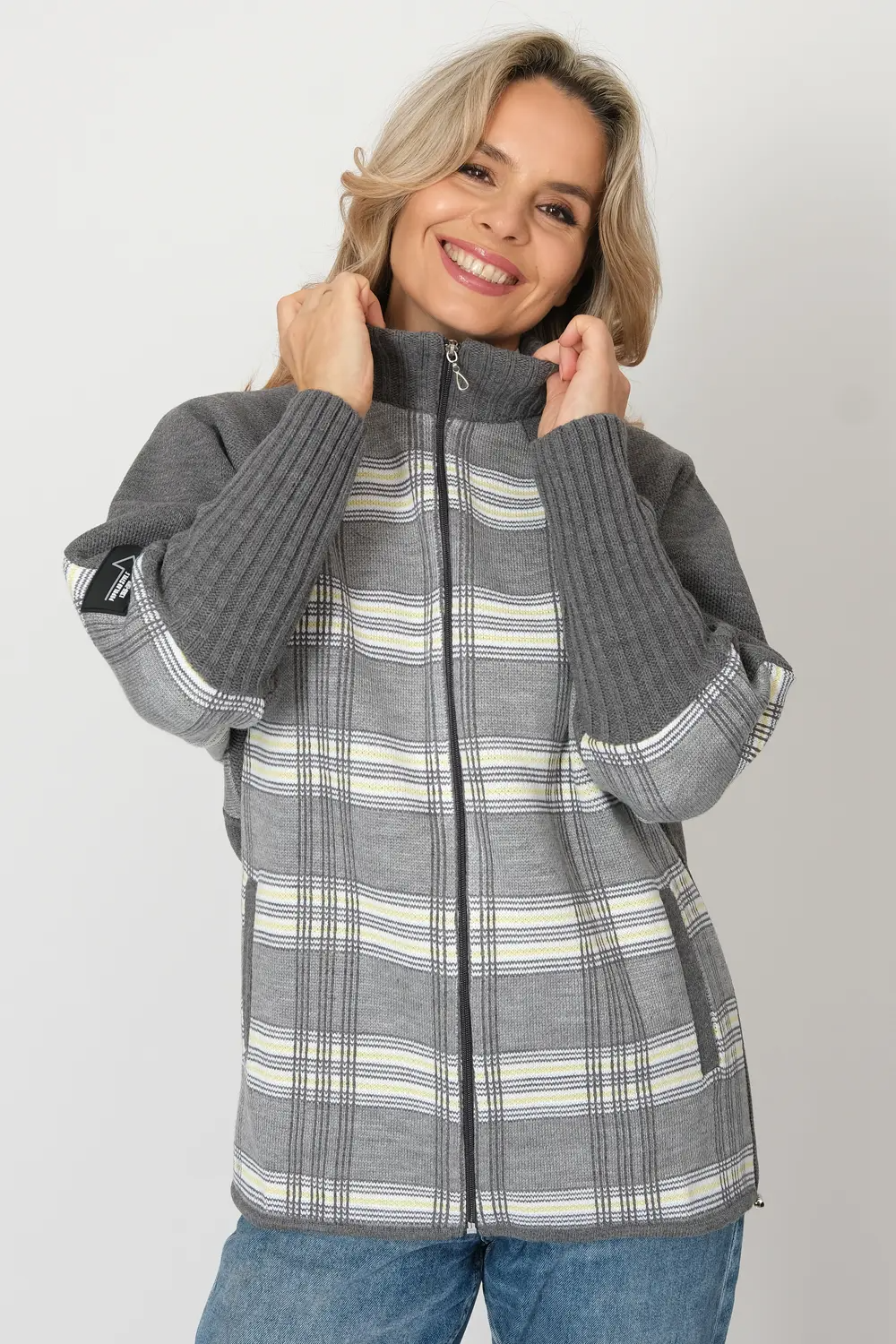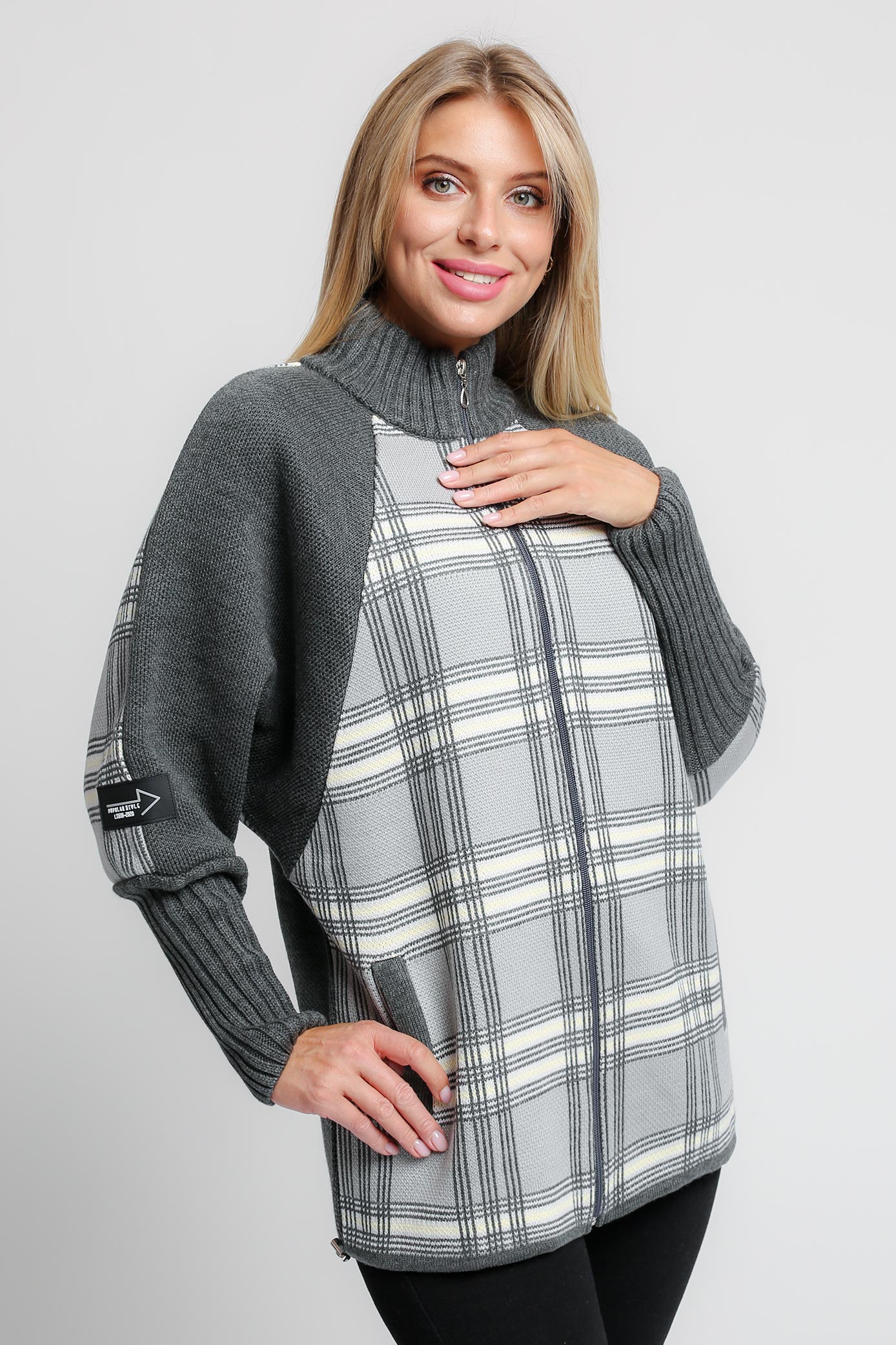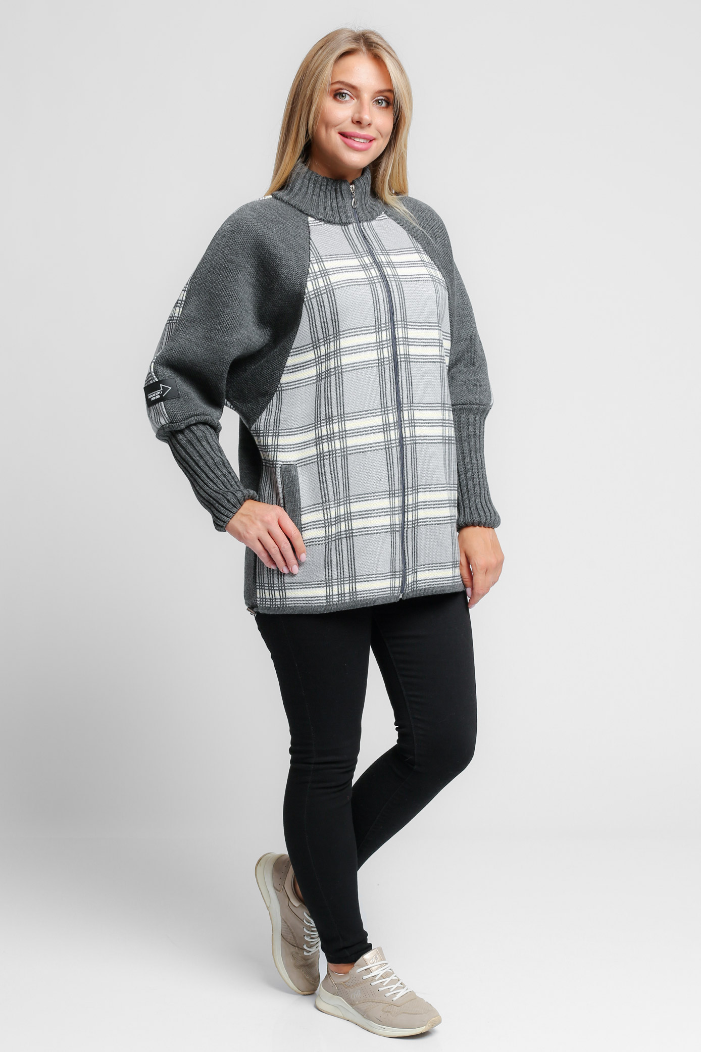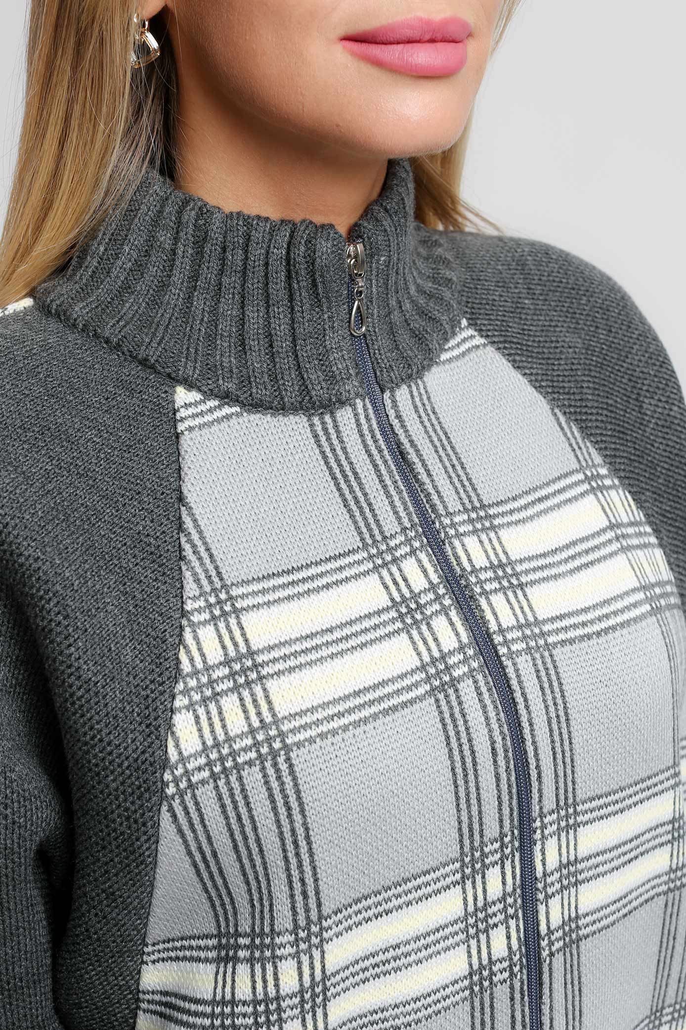 Жакет женский на молнии прямого силуэта в спортивном стиле, на молнии. Воротник-стойка, рукав-реглан  с эластичным манжетом.  По бокам вязанного жакета два прорезных кармана.  Жакет выполнен жаккардовым переплетением с комбинацией однотонного полотна  и  рисунком в клетку.