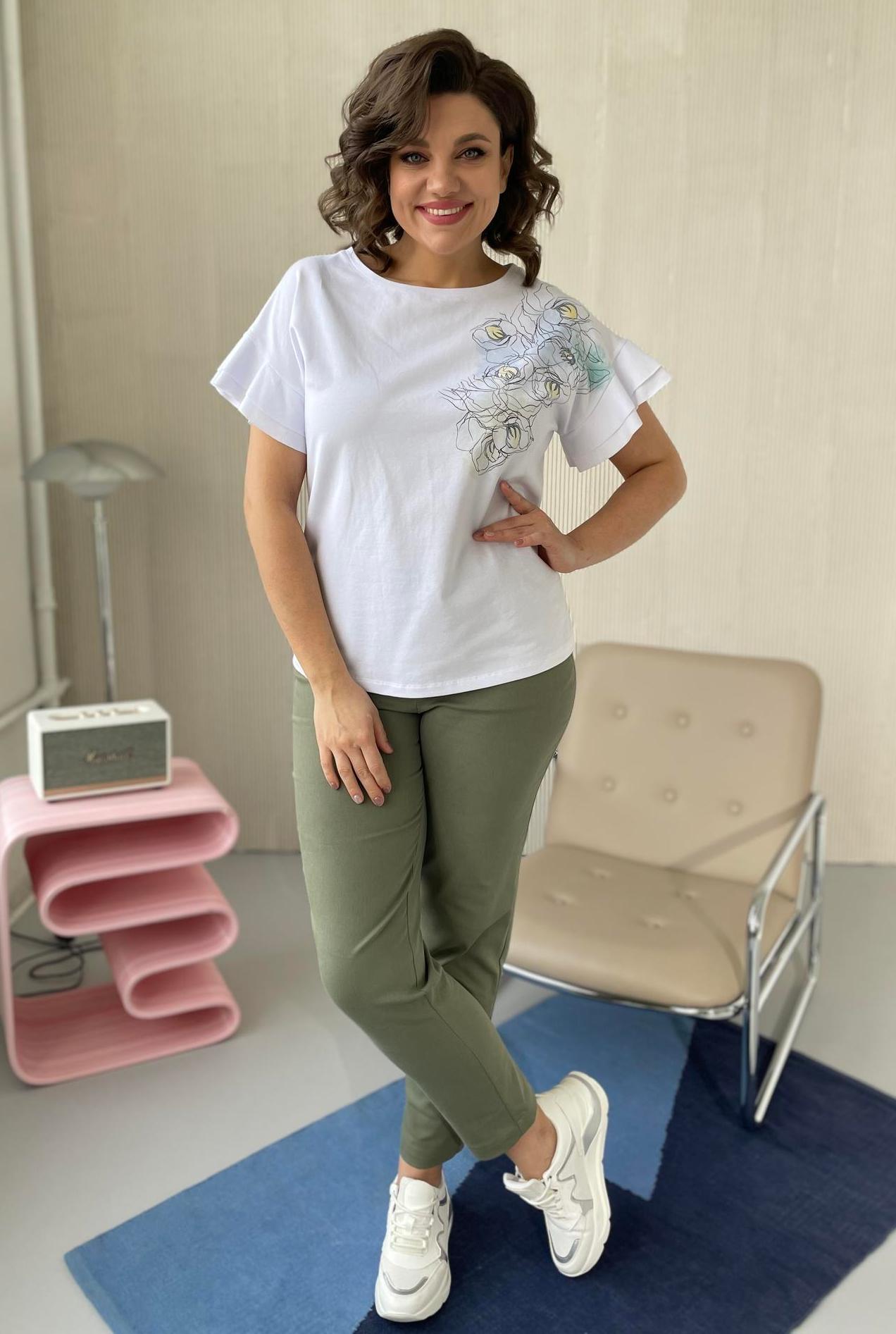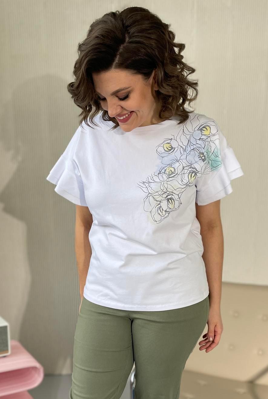 "Блузка женская из трикотажной ткани ,свободного силуэта. Вырез горловины круглый , оформлен бейкой. Пройма рукава оформлена воланами. Слева на груди расположен принт.