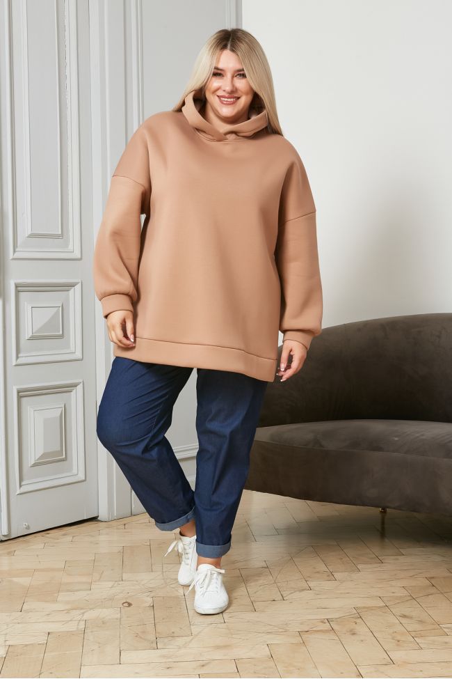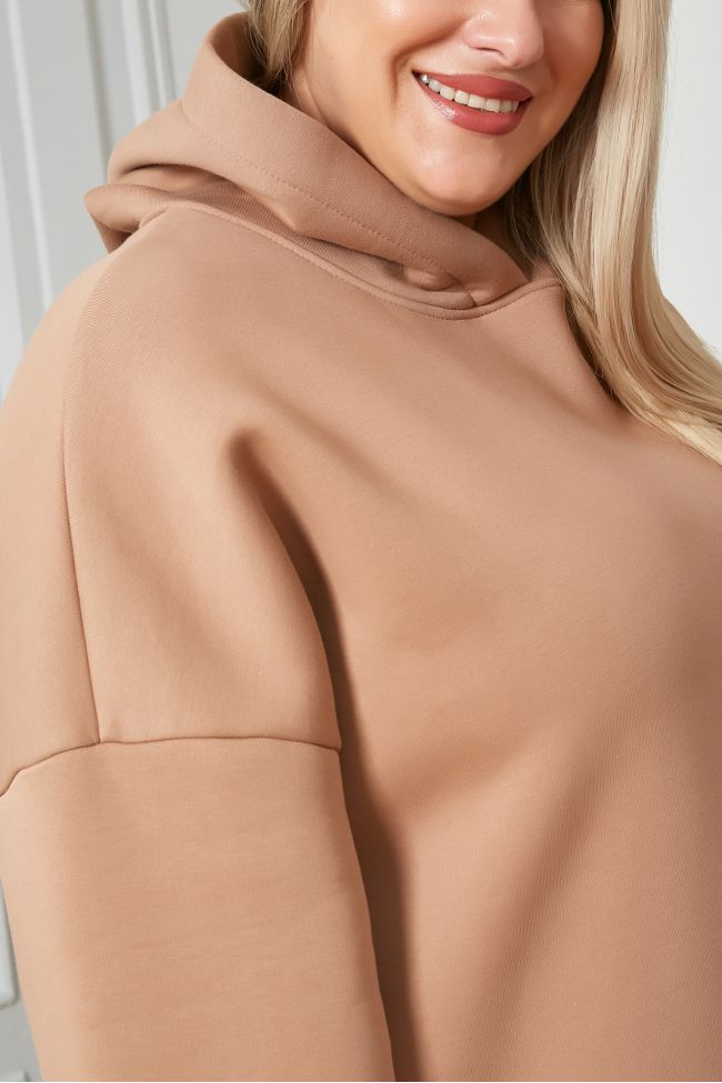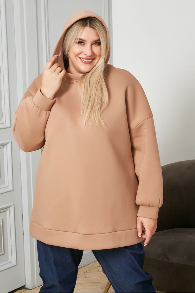 бежевый Толстовка "худи"  из однотонного футера с начесом.  Круглый вырез горловины дополнен капюшоном. Рукава втачные на спущенной линии плеча. Низ изделия и рукавов оформлен широкой манжетой. Модель прекрасно дополнит ваш гардероб в прохладное время года.