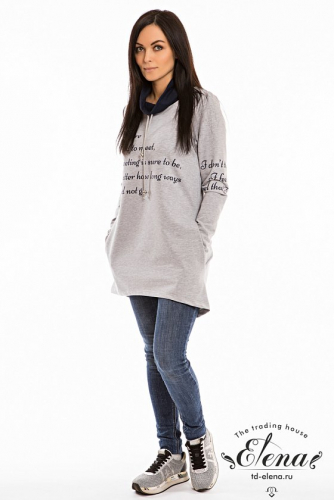 Толстовка из футер петли с лайкрой. Модель свободного силуэта, с длинными рукавами. Воротник выполнен из кулирного полотна с лайкрой контрастного цвета, внутри вставлен шнур. Спереди и на рукавах нанесён принт. В боковых швах расположены карманы.