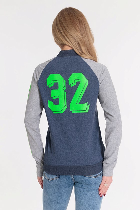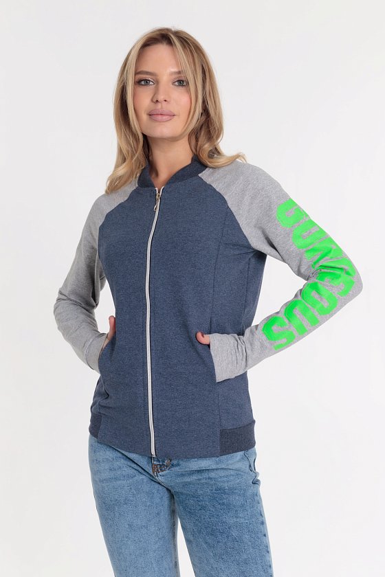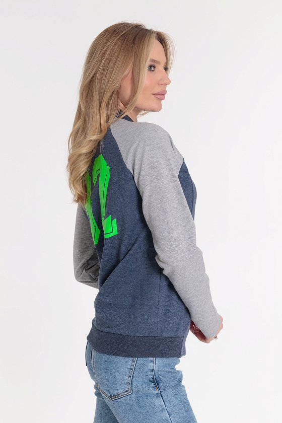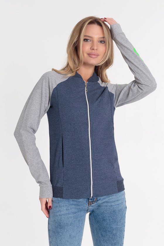 Толстовка выполнена из футер петли с лайкрой. Воротник и пояс из кашкорсе. Центральная застёжка на молнию. На спинке и рукаве нанесён принт.