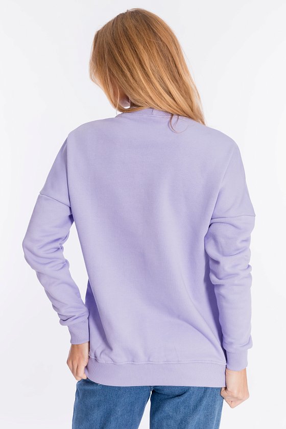 Толстовка свободного силуэта выполнена из футер петли (трёхнитка воздушка). Линия плеча спущена, спереди нанесён принт. Пояс и рукава с манжетами из кашкорсе.