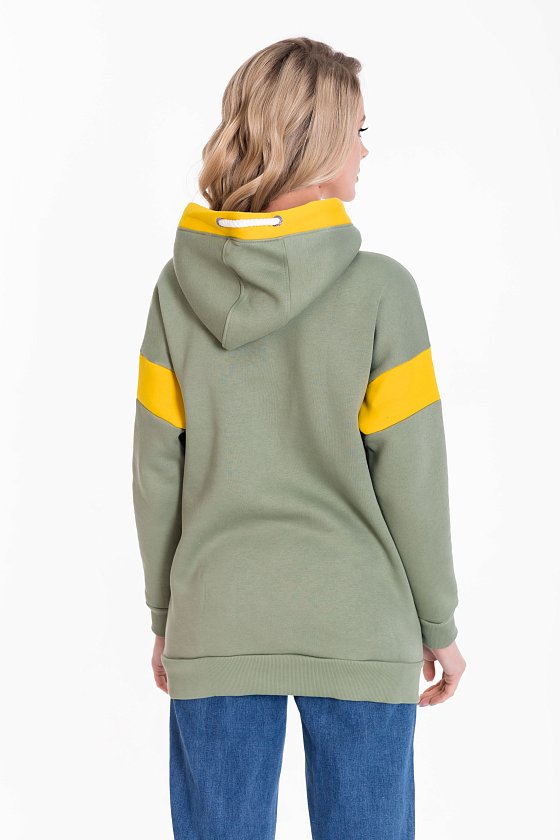 Толстовка выполнена из полотна с начёсом. Толстовка с длинным рукавом, притачными манжетами и поясом. Спереди расположен накладной карман-кенгуру и нанесён принт. Капюшон с планкой с люверсами, через которые проложен шнур.