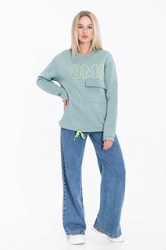 Женская толстовка из однотонного футера 3-х нитки с начёсом в цвете полынь - стильное и уютное изделие. Свободный крой и спущенный рукав с манжетами на резинке создают комфортный и модный образ. Декоративный большой карман поверх принта придает изделию оригинальность и интересный акцент.
