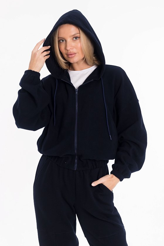 Женская укороченная толстовка oversize выполнена из мягкого трикотажного полотна "силаник". Модель с капюшоном на шнуре, спущенной линией плеча и длинными рукавами на резинке. Спереди — удобные карманы. Пояс также на резине. Застежка на молнию делает изделие практичным и удобным в носке.