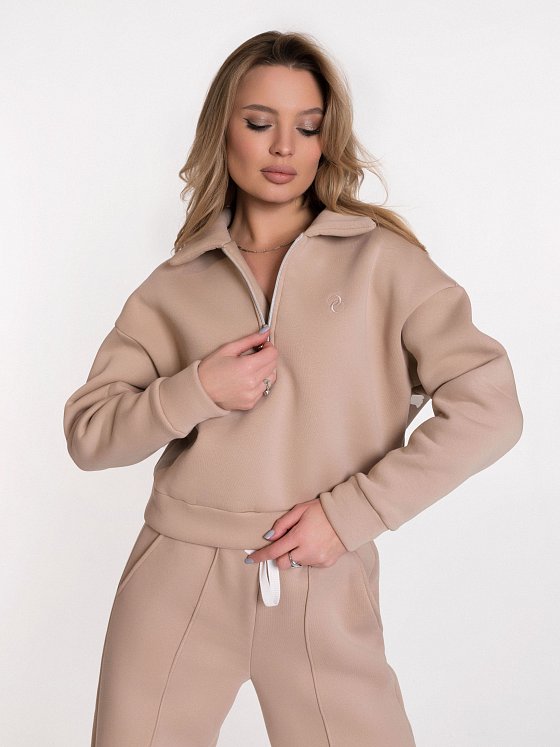 Женская толстовка с застежкой на короткую молнию и спущенной линией плеча. Модель выполнена из футера с начесом. Лаконичный дизайн дополнен стильной вышивкой с левой стороны. Манжеты рукавов и низ изделия оформлены планкой из основного полотна для аккуратного силуэта. Удобная и современная модель для повседневной носки.