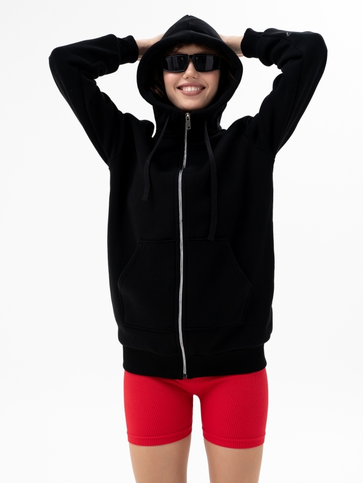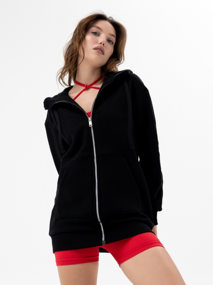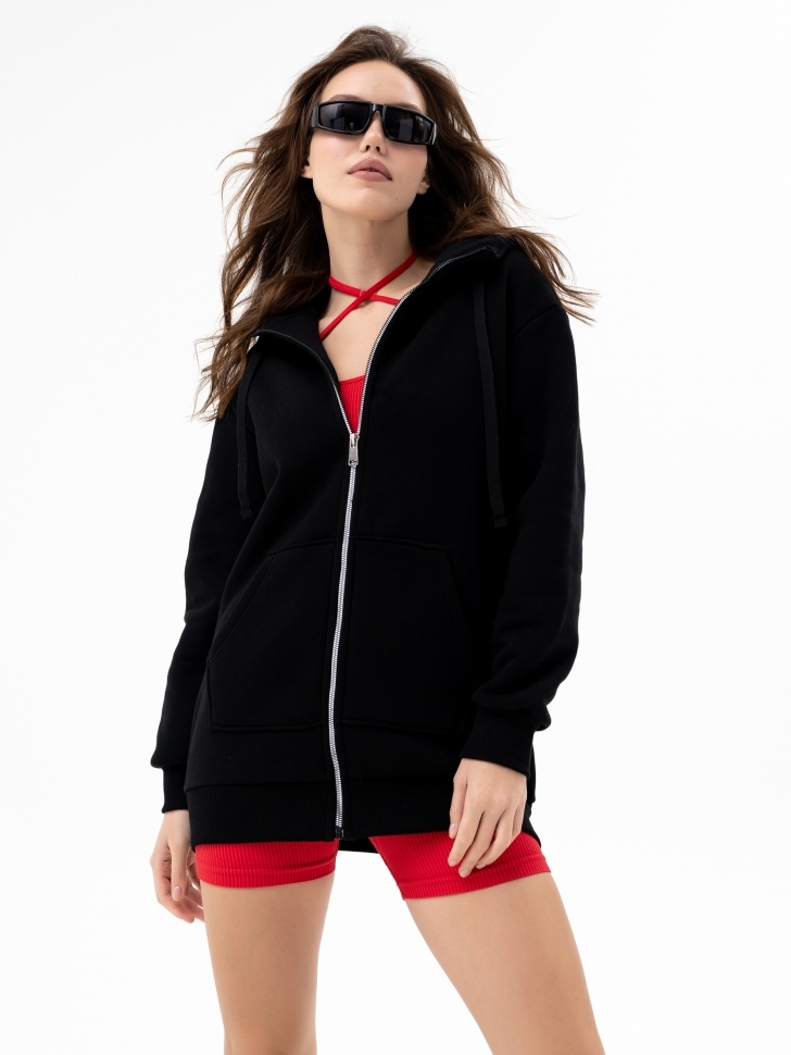 Удлиненная женская толстовка свободного силуэта с центральной застежкой «молния - трактор». Объемный капюшон с люверсами регулируется широким шнуром. На полочке размещены карманы-кенгуру. Широкая планка по низу изделия обеспечивает хорошее прилегание по фигуре. Футер, из которого пошито изделие - это гладкий снаружи, а изнутри мягкий и теплый трикотаж. Добавление полиэстера к хлопковому волокну сохранит яркость и износостойкость материала. Прослойки воздуха изнанки с начесом создают своеобразные тепловые ловушки, что не допустит возможного быстрого переохлаждения организма в холодное время года. Трикотажное полотно Турецкого производства не потеряет яркость цвета даже после множества стирок. Качество пошива изделия соответствует требованиям Госстандарта РФ. Этикетка промаркирована штрих кодами EAN 13. Рост модели на фото 175 см. Параметры модели: 84-60-92. Размер изделия на модели: 44. Материал: футер 3х нитка с начесом (хлопок 80%, п/э 20%)
