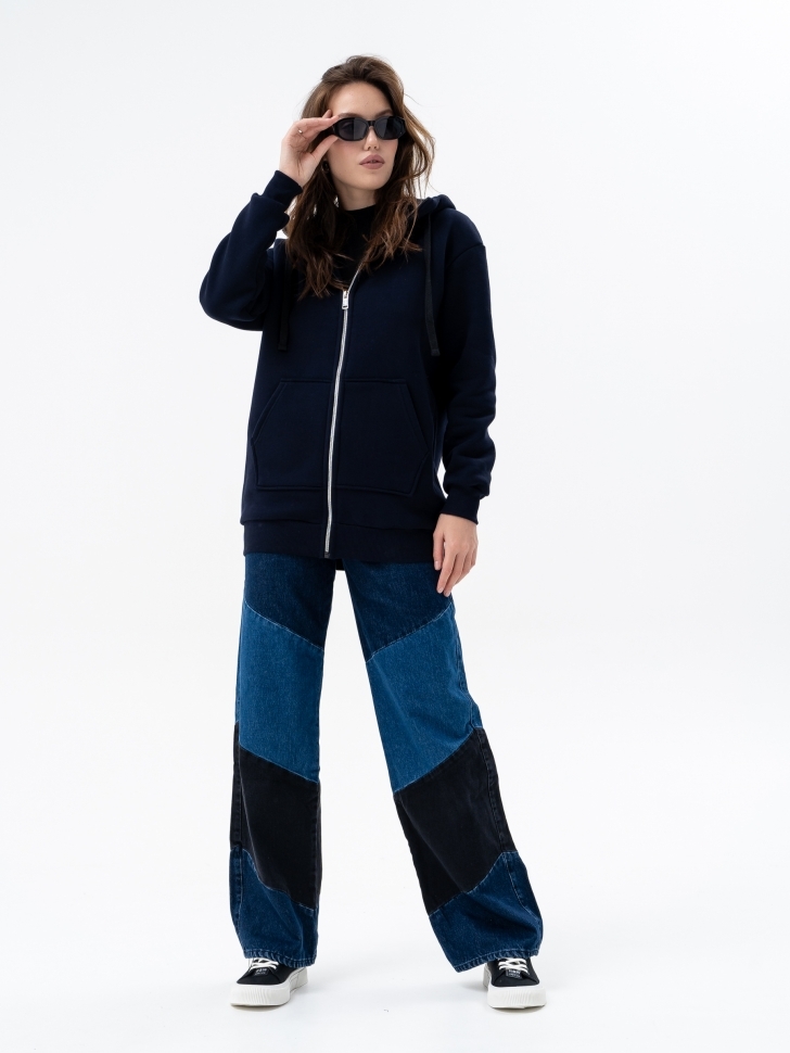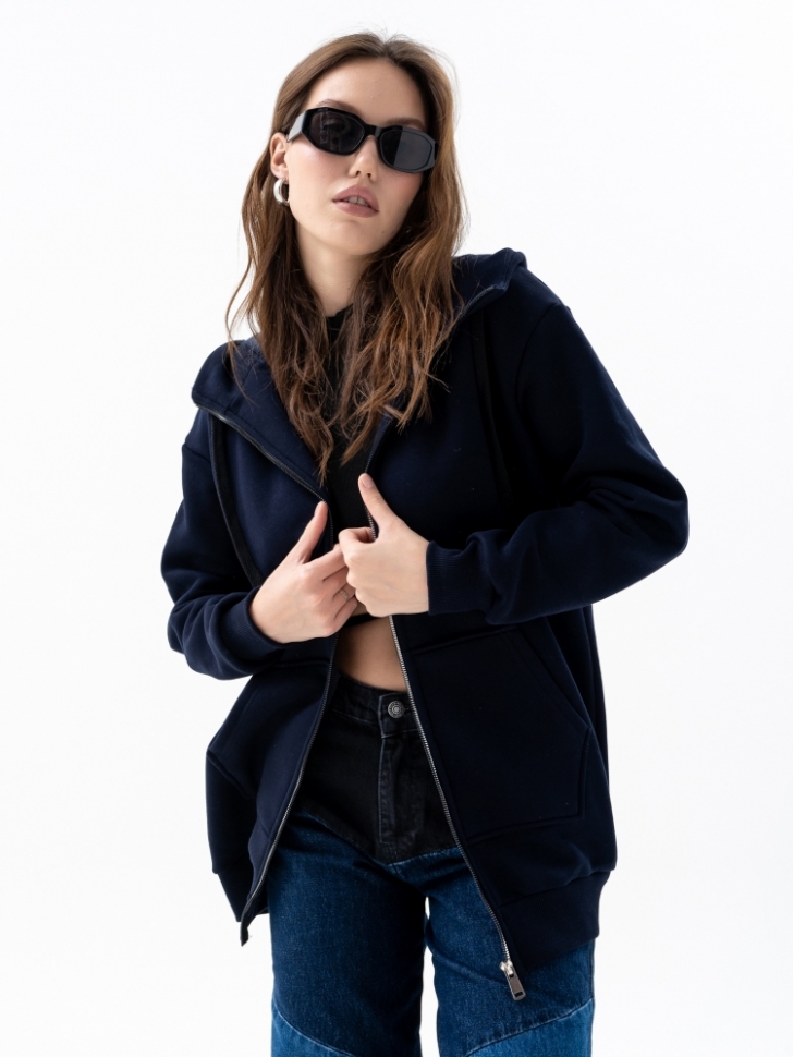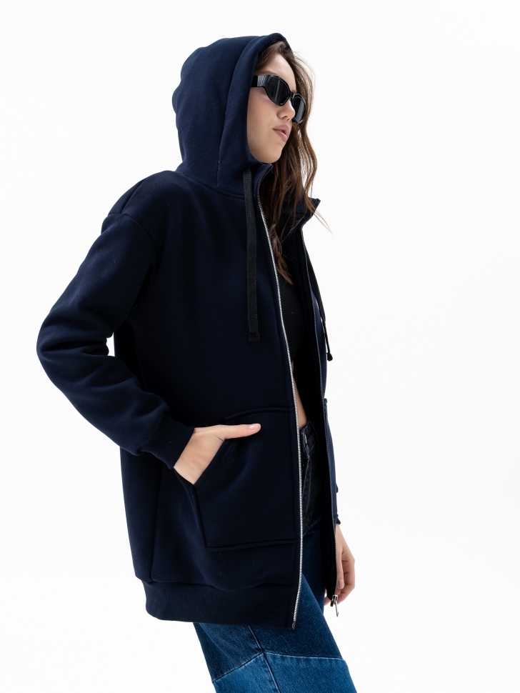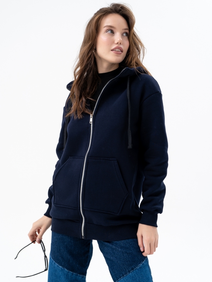 Удлиненная женская толстовка свободного силуэта с центральной застежкой «молния - трактор». Объемный капюшон с люверсами регулируется широким шнуром. На полочке размещены карманы-кенгуру. Широкая планка по низу изделия обеспечивает хорошее прилегание по фигуре. Футер, из которого пошито изделие - это гладкий снаружи, а изнутри мягкий и теплый трикотаж. Добавление полиэстера к хлопковому волокну сохранит яркость и износостойкость материала. Прослойки воздуха изнанки с начесом создают своеобразные тепловые ловушки, что не допустит возможного быстрого переохлаждения организма в холодное время года. Трикотажное полотно Турецкого производства не потеряет яркость цвета даже после множества стирок. Качество пошива изделия соответствует требованиям Госстандарта РФ. Этикетка промаркирована штрих кодами EAN 13. Рост модели на фото 175 см. Параметры модели: 84-60-92. Размер изделия на модели: 44. Материал: футер 3х нитка с начесом (хлопок 80%, п/э 20%)