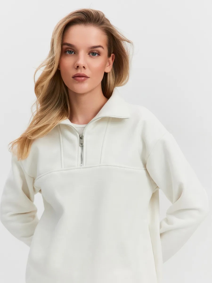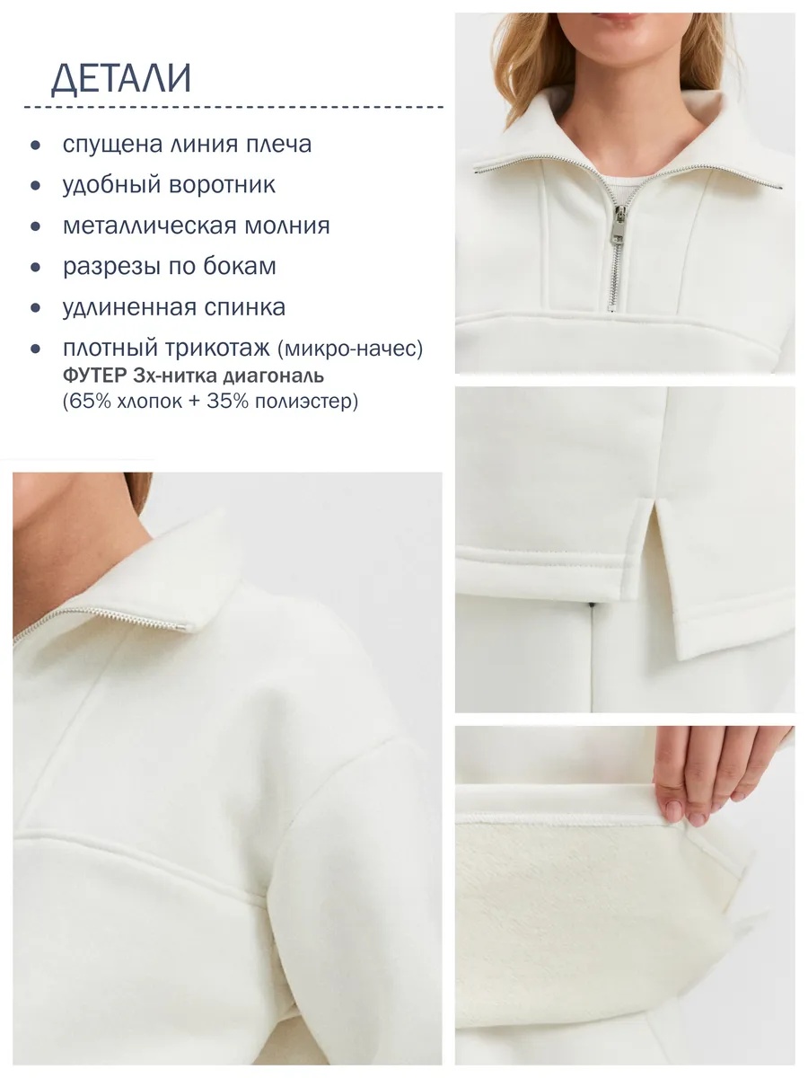 Женская толстовка из футера 3-х нитка микро-начес с "эффектом велюра". Толстовка с втачным рукавом и втачным модельным воротником. Центральная застежка на короткую металлическую молнию. Низ толстовки, низ рукавов обработаны на плоскошовной м-не. По боковым швам – разрезы.