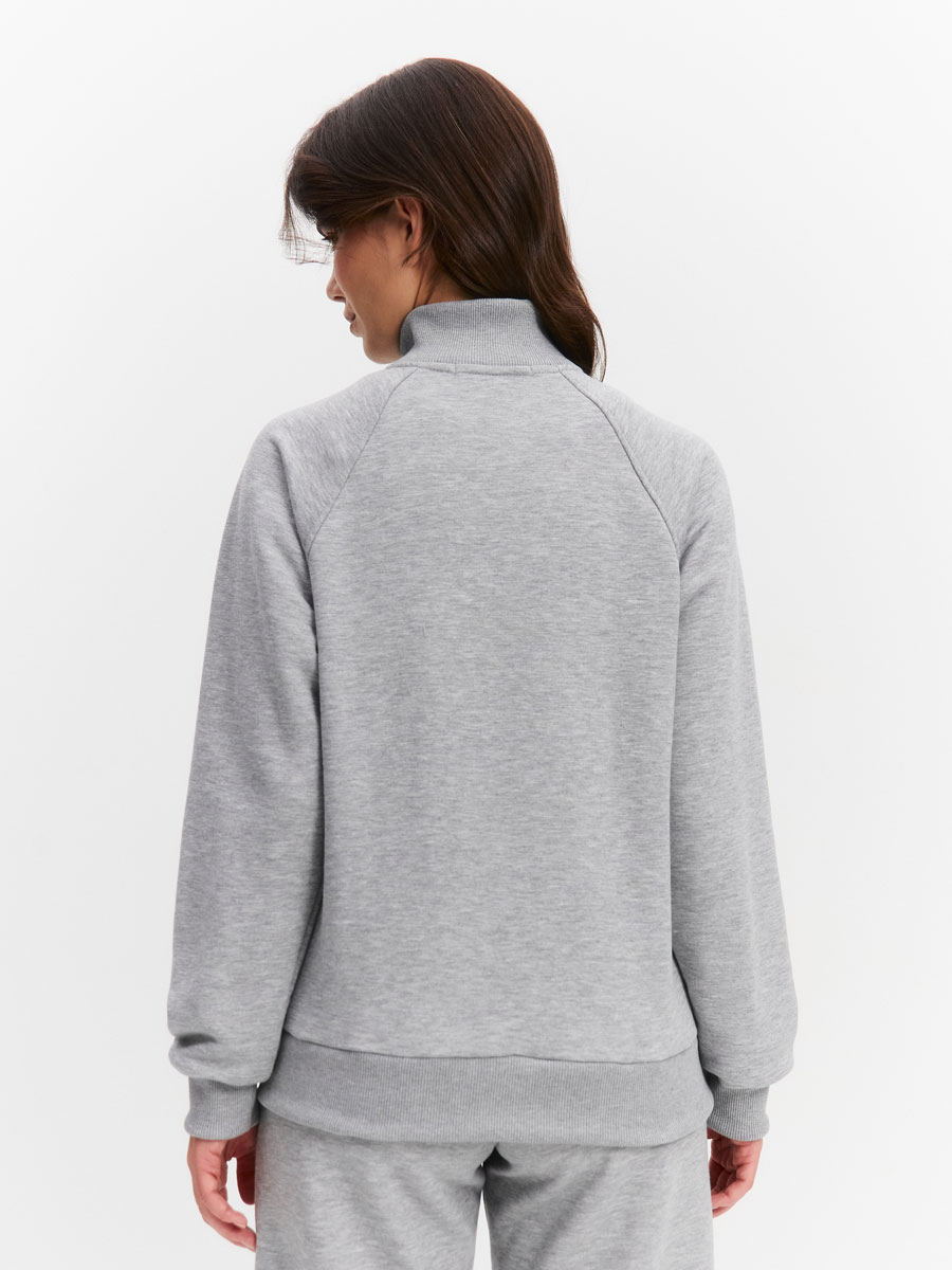 Женская толстовка на молнии из футера 3-х нитка, с рукавом покроя реглан и втачным воротником-стойкой. На полочке 2 прорезных кармана в рамку. Манжеты, пояс, воротник из кашкорсе. Центральная застежка на разъёмную молнию.