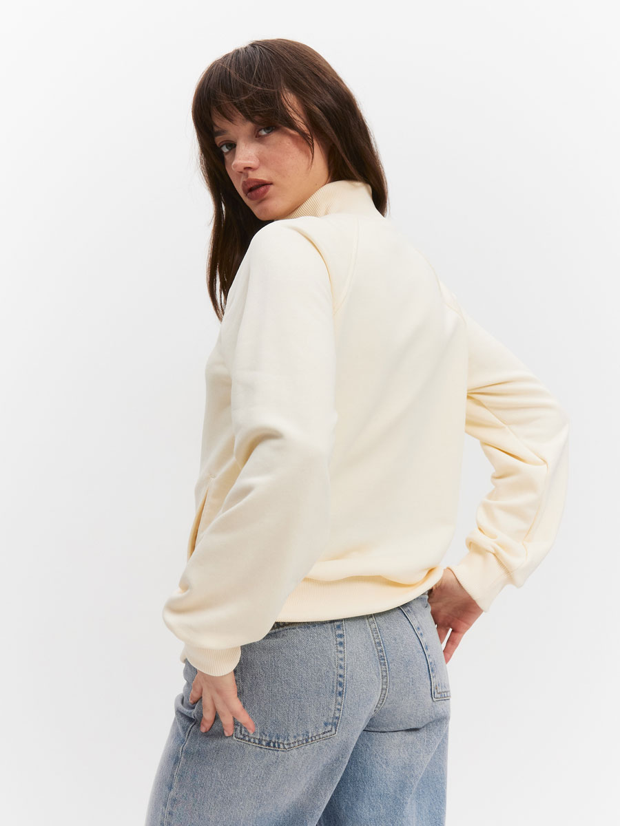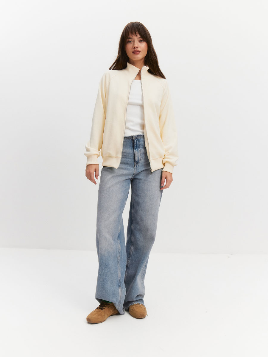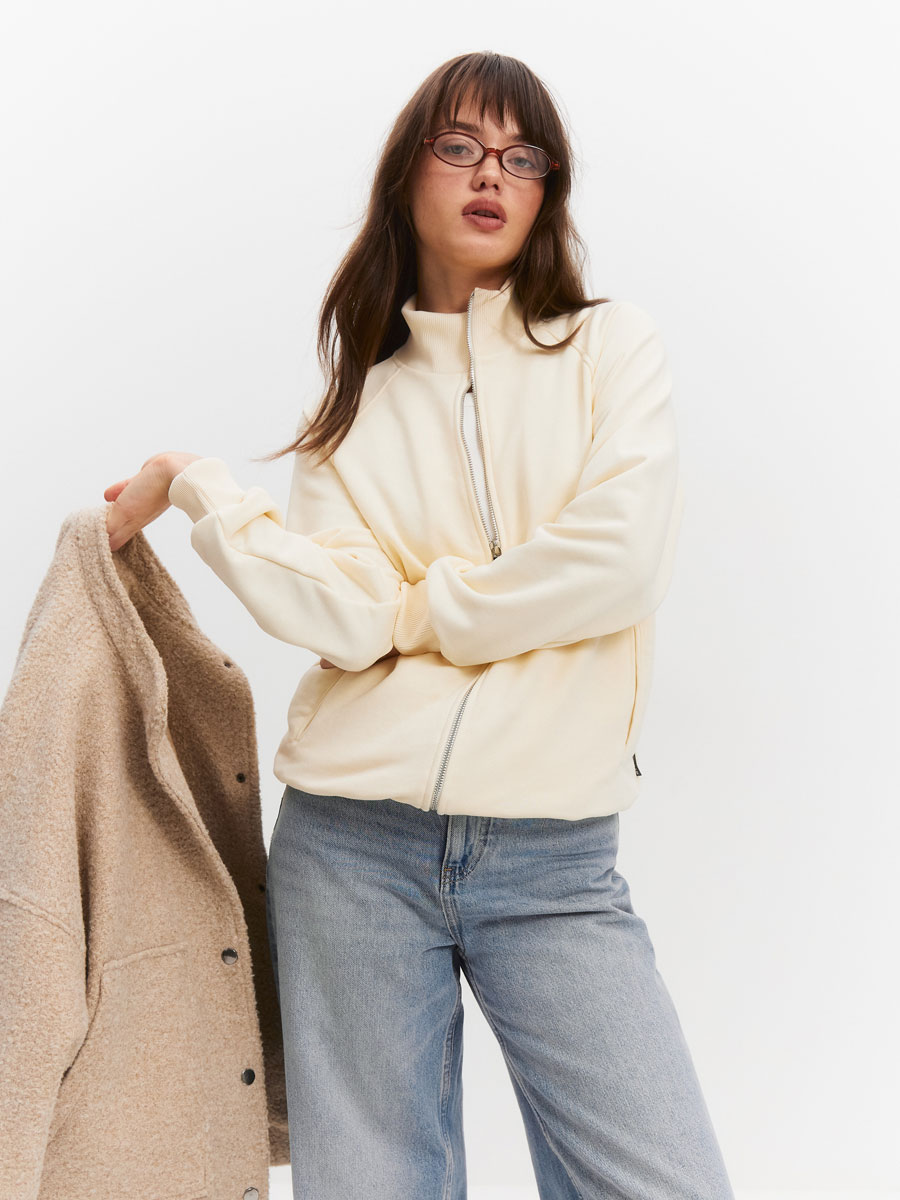 Женская толстовка на молнии из футера 3-х нитка, с рукавом покроя реглан и втачным воротником-стойкой. На полочке 2 прорезных кармана в рамку. Манжеты, пояс, воротник из кашкорсе. Центральная застежка на разъёмную молнию.