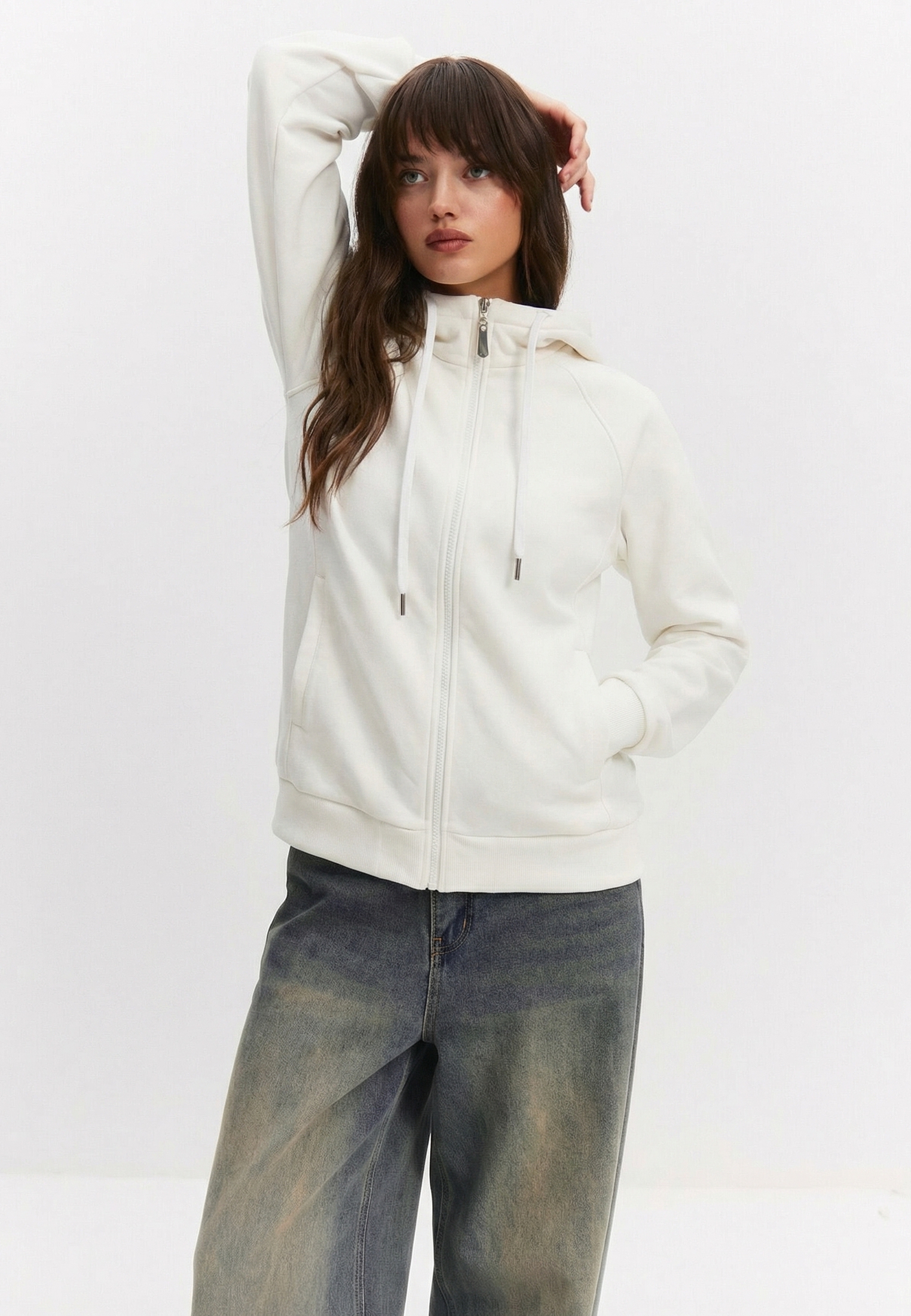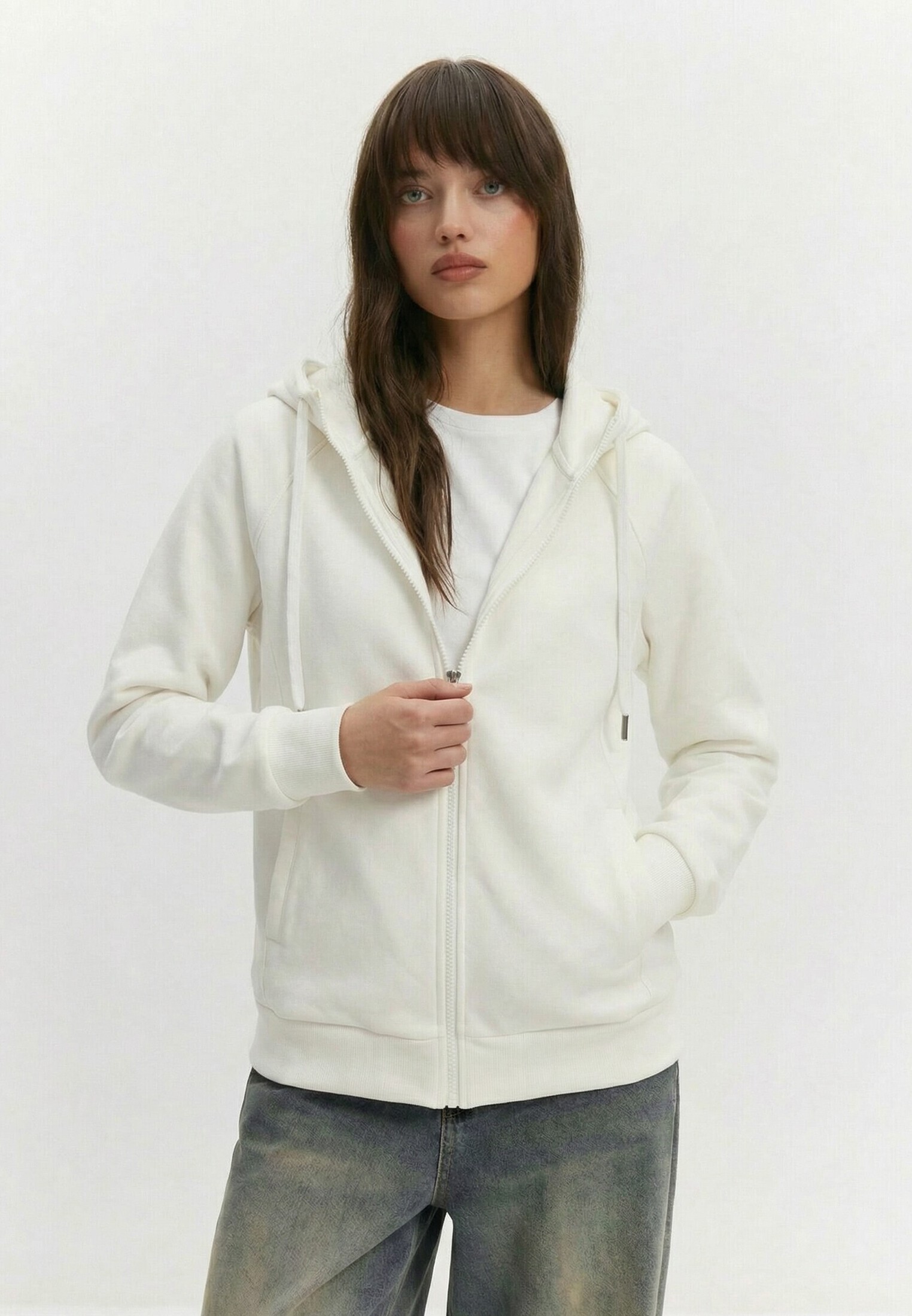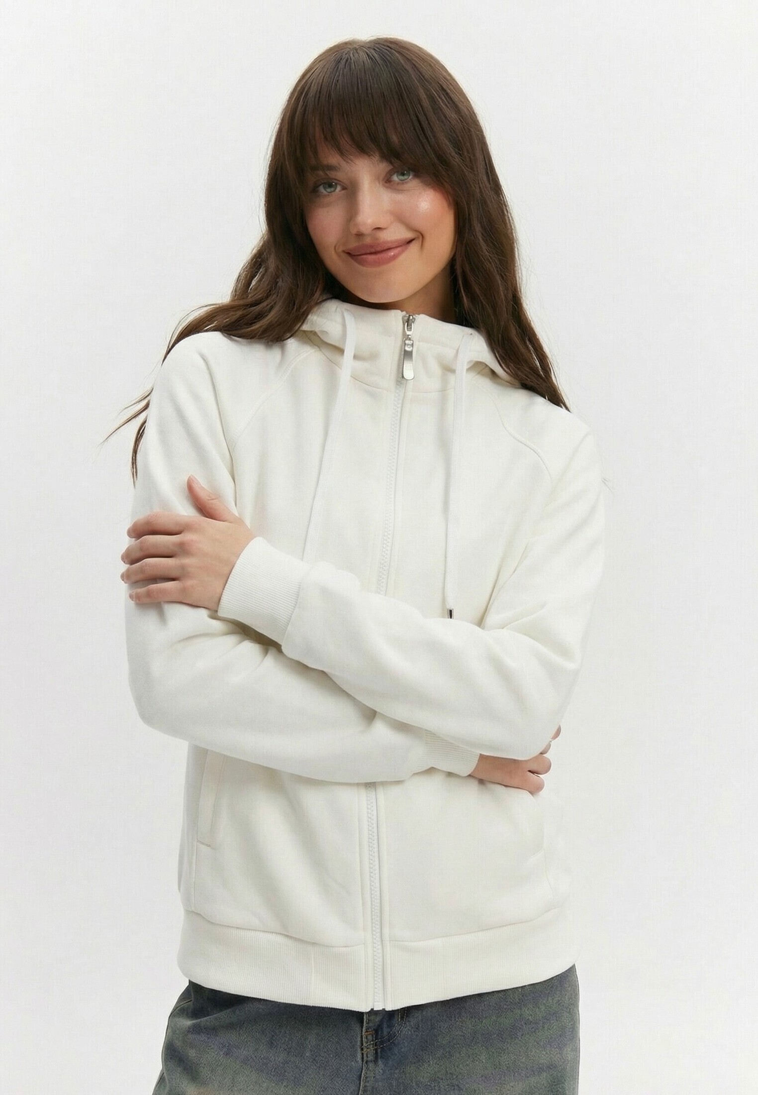 Женская толстовка с капюшоном из футера 3-х нитка диагональ микро-начес с "эффектом велюра". С центральной застежкой на молнию и втачным капюшоном. В капюшон вставлен шнур. В центральной молнии подвеска со светоотражением. Рукава покроя реглан. Манжеты и пояс из кашкорсе в цвет футера.  Карманы в рельефах переда. 95% хлопок, 5% эластан