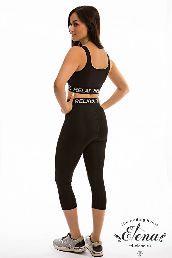 Спортивный топ из черного бифлекса с широкой отделочной резинкой по низу. Внутри мягкие чашечки, в качестве бретелей использована резина чёрного цвета, подкладка топа цветная.