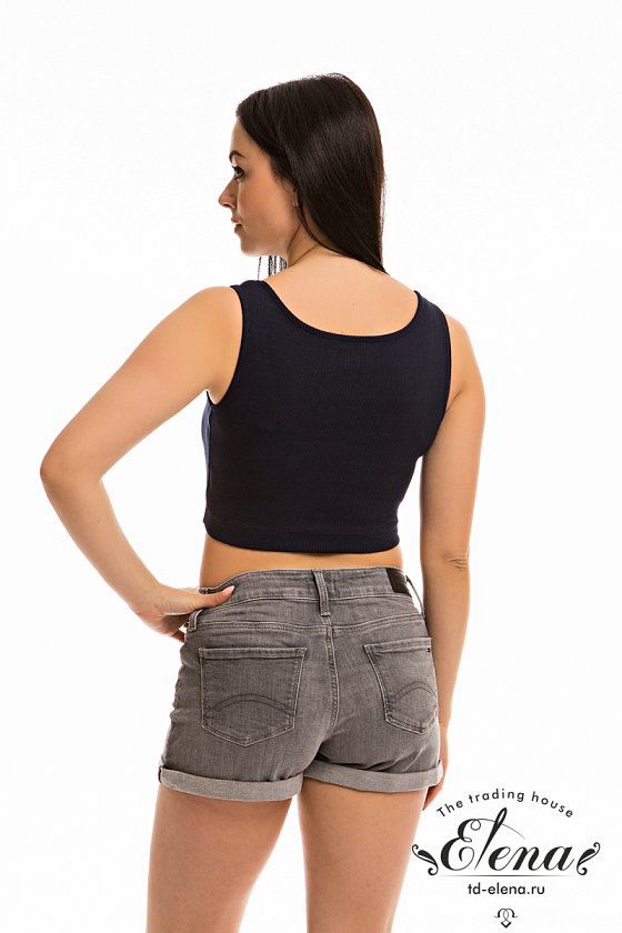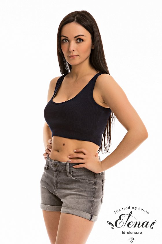Топ с мягким V-образным вырезом выполнен из кашкорсе с лайкрой. Горловина и проймы обработаны бейкой.