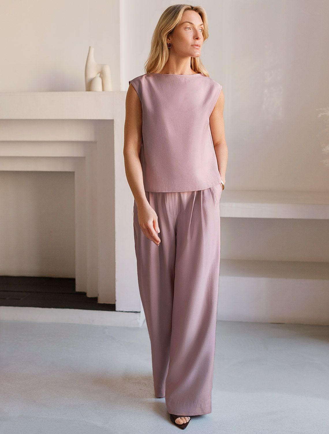 Изысканный топ нежного зефирно-розового цвета с элегантным вырезом-лодочкой, выполненный из плотного лиоцелла. Лиоцелл это более дорогой и экологичный вариант вискозы, очень прочный и шелковистый. Ткань отличается от регулярной коллекции из лиоцелла - она содержит еще больше лиоцелла (92%), благодаря чему имеет более нежную шелковистую фактуру. Вырез лодочка придает топу утонченность, а небольшие разрезы по бокам добавляют легкости. Простой прямой крой в сочетании с интересными деталями создает стильную и в то же время комфортную вещь. Топ средней длины подойдет для любительниц базовой одежды, которые хотят деликатно повысить градус своего стиля. Этот лаконичный топ будет идеальным выбором для теплого времени года или многослойных ансамблей. Комплект из лиоцелла подчеркнет ваш вкус и статус. Это идеальный выбор для особенных моментов. Такой образ будет уместен на торжественных мероприятиях и приемах, выпускных вечерах, семейных праздниках и свадьбах.