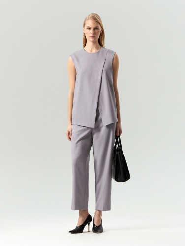 Блуза-жилет в изысканном оттенке: серый с лиловым подтоном выглядит необычно. По-весеннему лёгкая костюмная ткань с содержанием вискозы комфортно ощущается на теле. Эта вещь будет идеальна и в офис, и к выходным, и на праздник. Она достаточно лаконичная для будней и в то же время достаточно небанальная для особых случаев. Модель внахлёст дополнена стильным драпированным поясом с изящной застёжкой в серебряном цвете. Пояс эластичный, выполнен на резинке. Жилет эффектно смотрится и под пояс, и без. Завершить образ можно брюками или юбкой из комплекта.