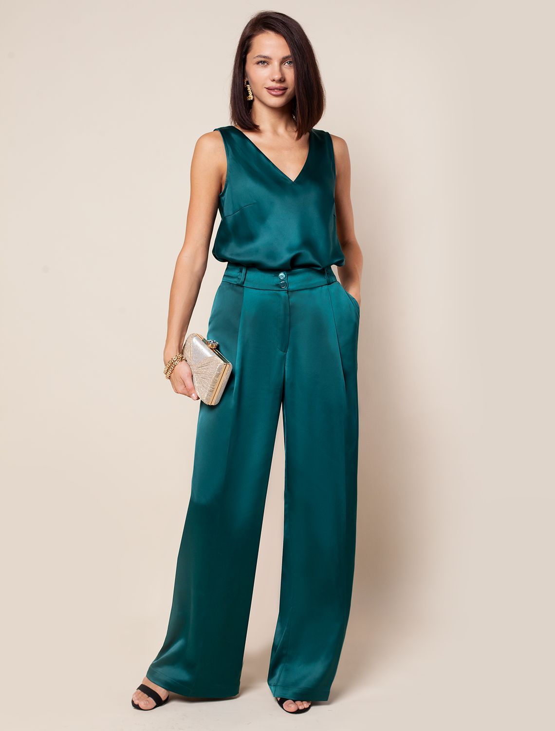 Топ с V-вырезом выполнен из тончайших нитей плотного сатина, плетение которых создает полуматовый блеск, напоминающий натуральный шёлк. Модель, скроенная по косой мягко, струится по телу и почти не мнется. Совет стилиста: сочетайте топ в костюме вместе с брюками D24.534 и юбкой D26.461 чтобы создать роскошный праздничный образ, или используйте как яркий акцент в базовом гардеробе, с вязаными вещами, денимом и эко-кожей. зеленый