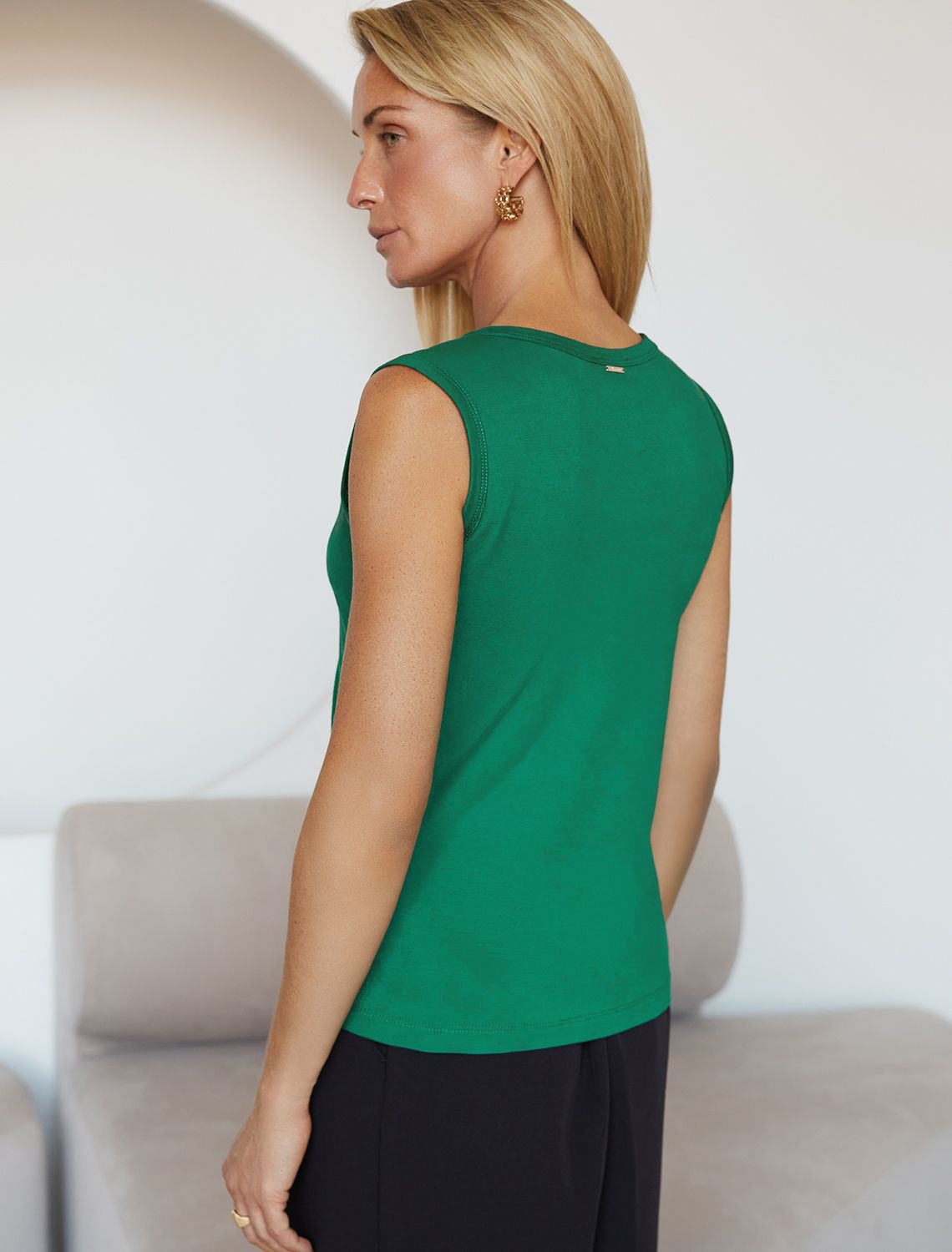 Топ выполнен из премиального хлопка с эластаном. V- вырез подчеркивает линию декольте и визуально вытягивает шею. Лаконичная базовая модель впишется в любой гардероб и дополнит многослойные образы. Материал изделия хорошо тянется и гарантирует идеальную посадку по фигуре. Из украшений только металлическим логотипом бренда. зеленый