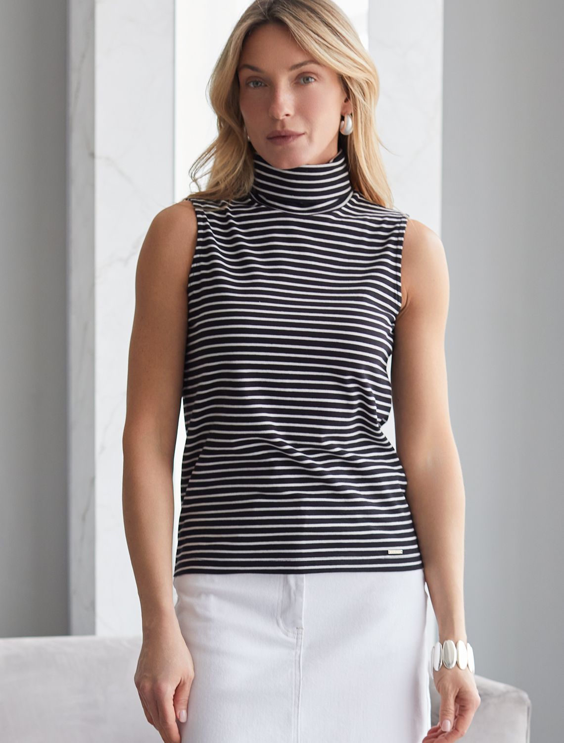 Топ с воротом как у водолазки выполнен из премиального хлопка. Наличие эластана в составе изделия способствует формоустойчивости. Модель хорошо будет сочетаться в комплекте с жакетом или кардиганом, так как отсутствие рукавов позволит комфортное использование в многослойных образах. Из украшений металлический логотип бренда.