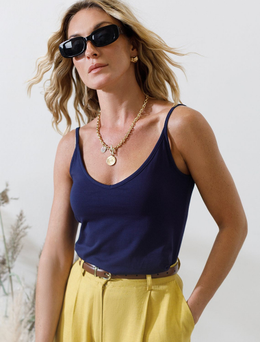 Топ с V-вырезом выполнен из премиального хлопка. Модель дополнена регулируемыми бретелями, позволяющими носить изделие на нужном уровне. Эластичный материал гарантирует комфорт и формоустойчивость. Из украшений металлический логотип бренда.