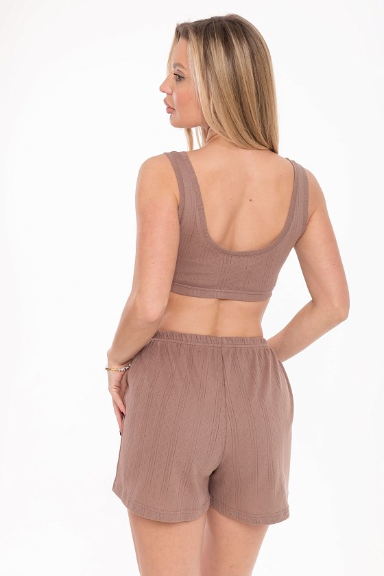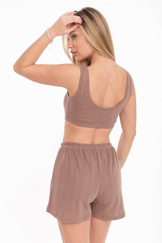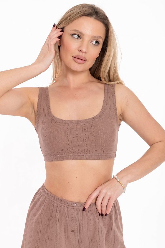 Топ выполнен из трансферной рибаны, обеспечивающей идеальную посадку по фигуре. Облегающий крой модели подчеркивает естественные линии тела. Широкий вырез и низкая линия спинки создают элегантный силуэт, а бретели обеспечивают удобство. Резинка по низу топа гарантирует комфортную посадку, не сползая в течение дня. Этот топ станет стильной и удобной основой для домашнего отдыха и расслабления.