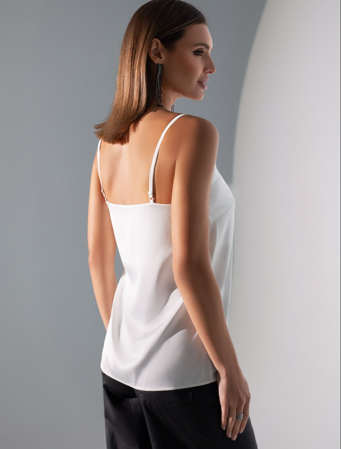 Элегантный топ натурального белого цвета с регулируемыми лямками выполнен из сатиновой ткани премиального качества, сочетающей полиэстер и эластан в составе. Этот уникальный дуэт материалов обеспечивает комфортную посадку топа. Универсальный крой делает топ идеальным базовым элементом как для повседневных образов с джинсами или юбкой, так и для вечерних луков под жакет или кардиган. натуральный белый