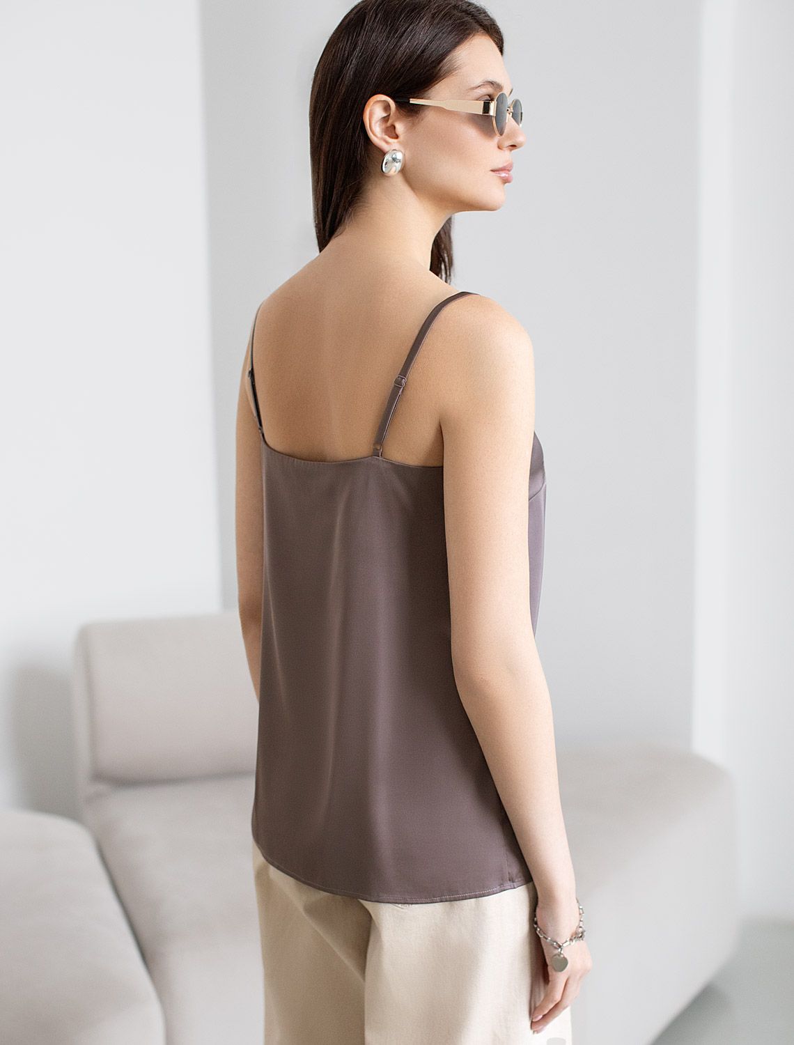 Элегантный топ кофейного цвета с регулируемыми лямками выполнен из сатиновой ткани премиального качества, сочетающей полиэстер и эластан в составе. Этот уникальный дуэт материалов обеспечивает комфортную посадку топа. Универсальный крой делает топ идеальным базовым элементом как для повседневных образов с джинсами или юбкой, так и для вечерних луков под жакет или кардиган.