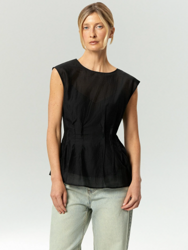 Полупрозрачный топ в чёрном цвете станет любимой вещью в гардеробе. Сделан из нежного, лёгкого тенсела с небольшим добавлением нейлона для прочности и блеска. Шелковистый материал особенно приятен к телу и обладает свойствами терморегуляции, что делает его ещё привлекательнее в летнюю жару. В комплекте идёт непросвечивающая вискозная майка с красивым вырезом. Очень женственный приталенный фасон топа дополнен изящной деталью: защипами в области талии. Модель идеальна как соло, так и в качестве первого слоя для образов с жакетами, отлично сочетается с любым базовым низом. Воздушность, лёгкий блеск, акцент на талии делают топ достаточно нарядным для любого праздника. А базовая расцветка и понятный, не перегруженный фасон позволяют носить его и в будни. Это незаменимая вещь с большим потенциалом в стилизации.