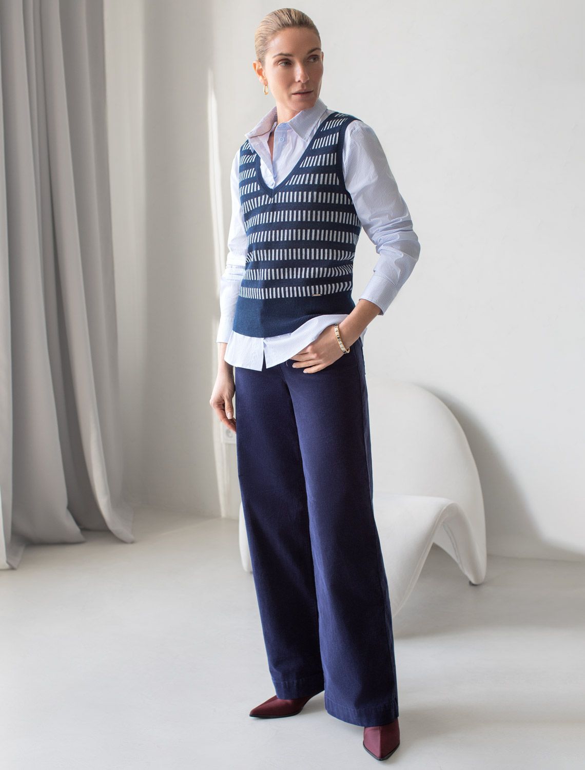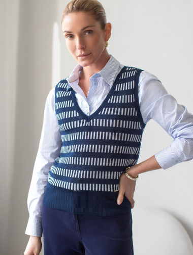 Топ из тонкого жаккарда выполнен из вискозы. Вертикальный вывязанный принт визуально стройнит и вытягивает силуэт. Добавление в состав ПЭ способствует легкости и износостойкости изделия. Мягкая пряжа приятно ощущается на теле и дарит настоящий комфорт в теплое время года. Можно стилизовать изделие в многослойных образах как жилет. синий-белый