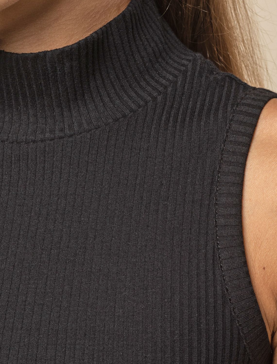 Топ с воротом стойкой выполнен из трикотажа в широкий рубчик. Премиальное качество хлопковых волокон и наличие эластана в составе изделия способствуют идеальной посадке по фигуре не сковывая движений. Изделие сохранит свой безупречный внешний вид в течении долгого времени. Модель хорошо сочетается в многослойных осенних образах, с жакетами и кардиганами. черный