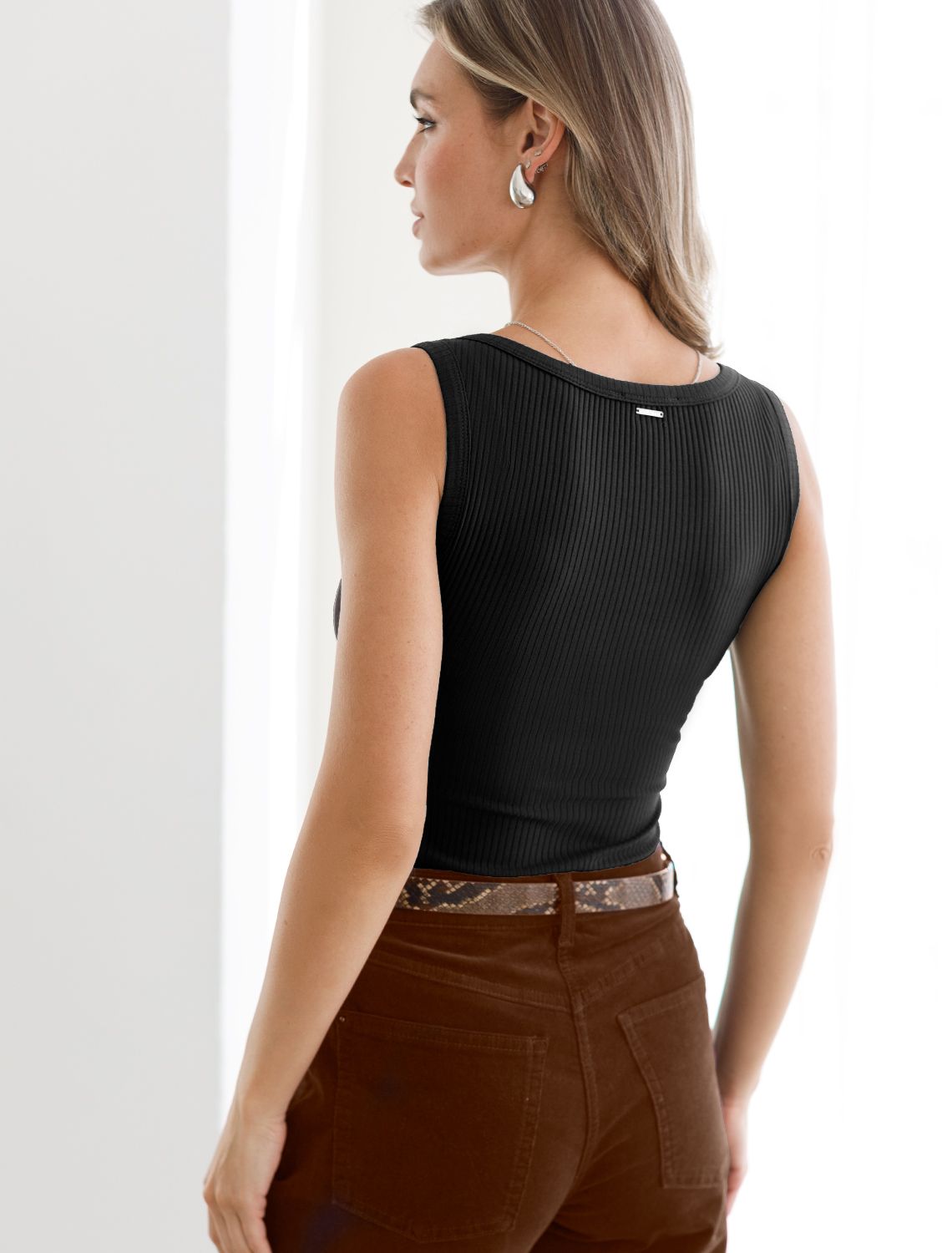 Топ выполнен из трикотажа в широкий рубчик. Эластичный хлопковый трикотаж сидит по фигуре, не сковывает движений и очень комфортный в носке. Фактура вертикальных полос визуально стройнит и вытягивает силуэт. Базовое изделие хорошо впишется в любой гардероб. Идеально подходит для многослойных образов. черный