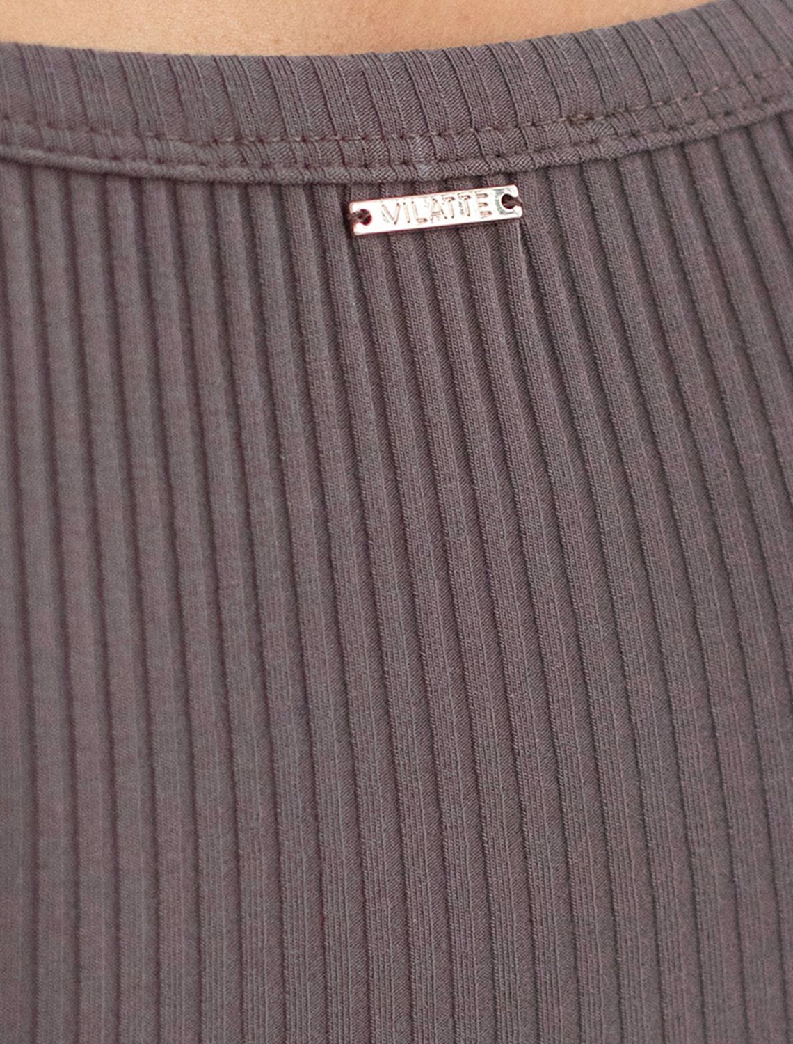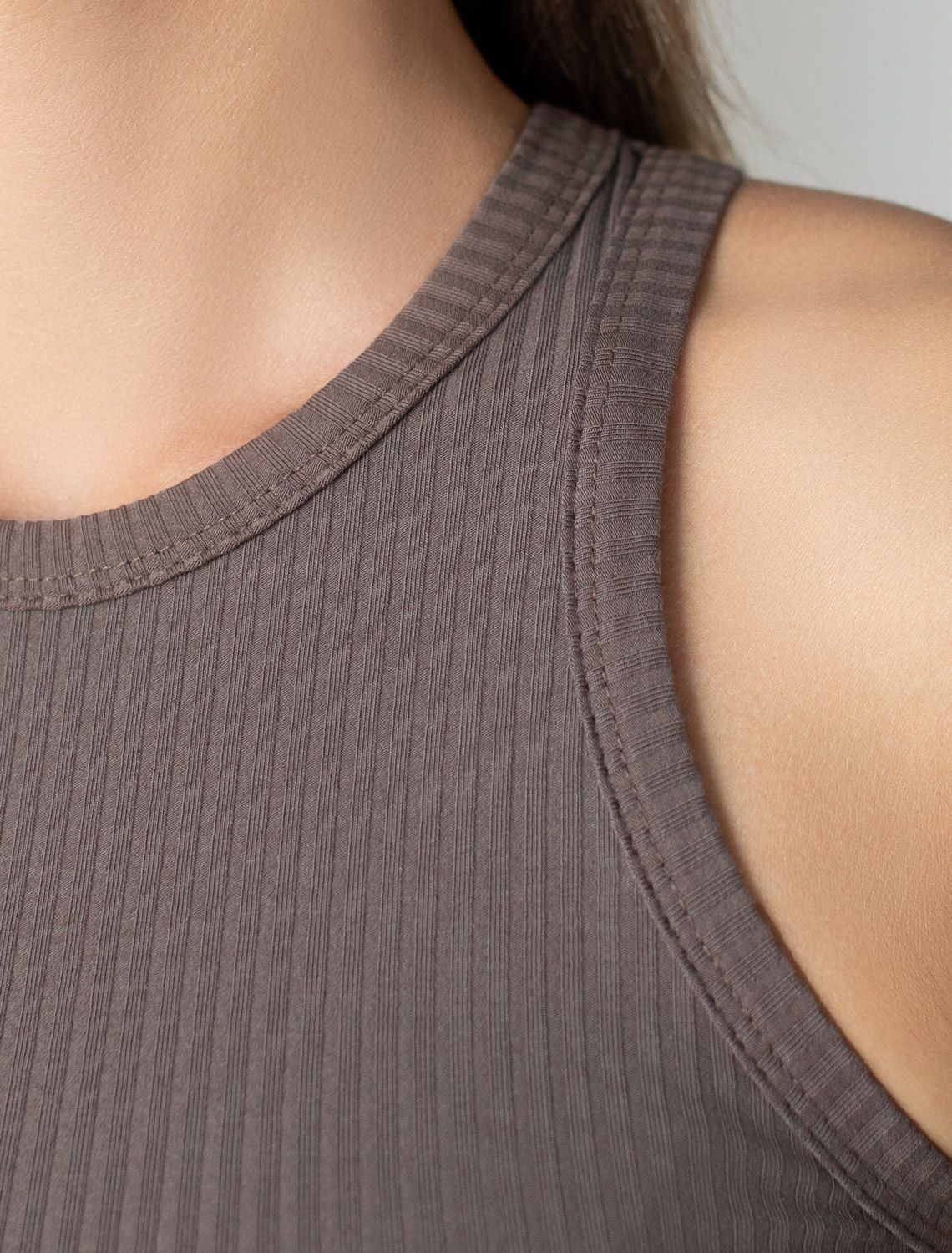 Топ выполнен из трикотажа в широкий рубчик. Эластичный хлопковый трикотаж сидит по фигуре, не сковывает движений и очень комфортный в носке. Фактура вертикальных полос визуально стройнит и вытягивает силуэт. Базовое изделие хорошо впишется в любой гардероб. Идеально подходит для многослойных образов. кофейный