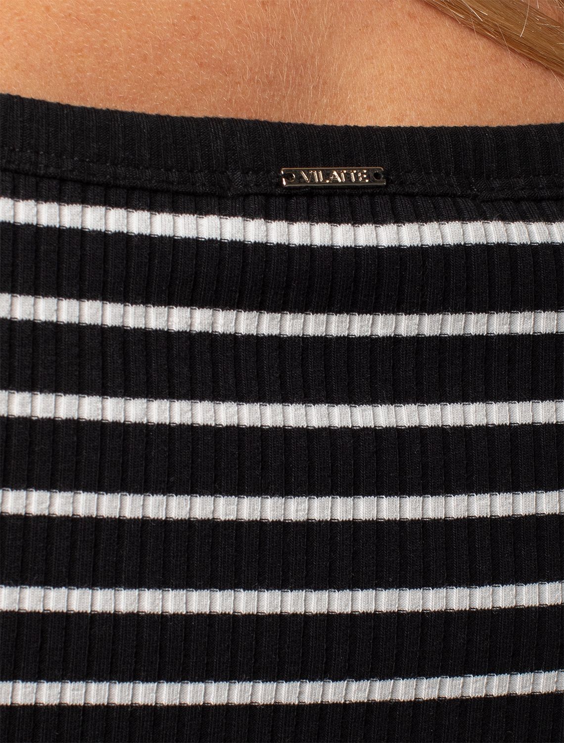 Топ выполнен из трикотажа в широкий рубчик. Премиальное качество хлопковых волокон и наличие эластана в составе изделия, обеспечивают абсолютный комфорт, не сковывая движений. Изделие обладает хорошей формоустойчивостью и надолго сохранит свой безупречный внешний вид. Металлический логотип бренда. черно-белый