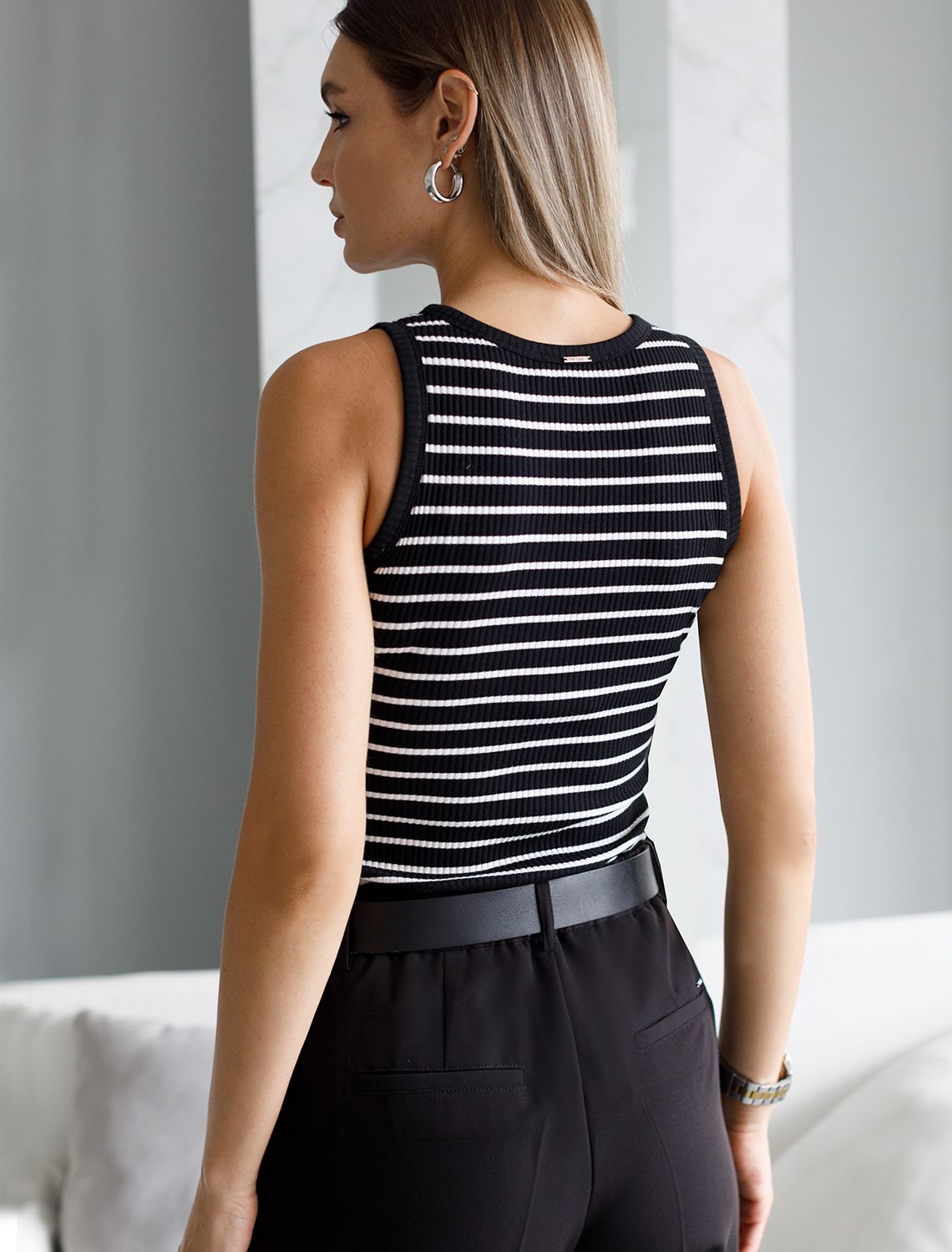 Топ выполнен из трикотажа в широкий рубчик. Премиальное качество хлопковых волокон и наличие эластана в составе изделия, обеспечивают абсолютный комфорт, не сковывая движений. Изделие обладает хорошей формоустойчивостью и надолго сохранит свой безупречный внешний вид. Металлический логотип бренда. черный с белым