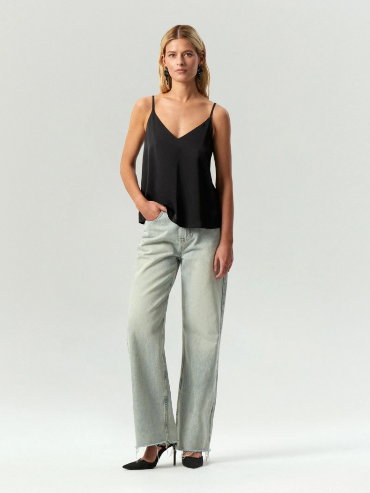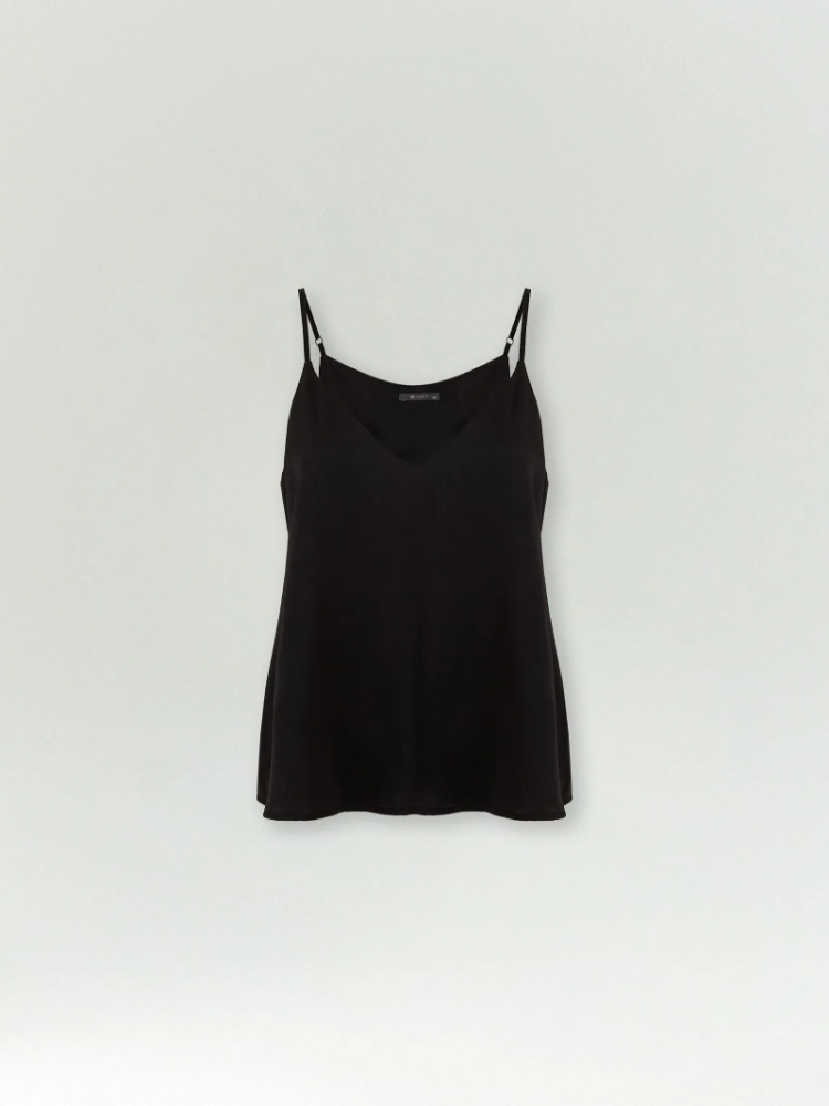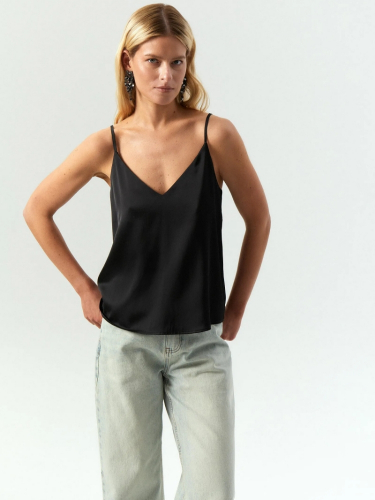 Топ в чёрном цвете для повседневных и нарядных образов. Выполнен из материала с высоким содержанием вискозы. Модель на регулируемых тонких бретелях имеет широкий V-образный вырез. Подойдёт к любому базовому низу