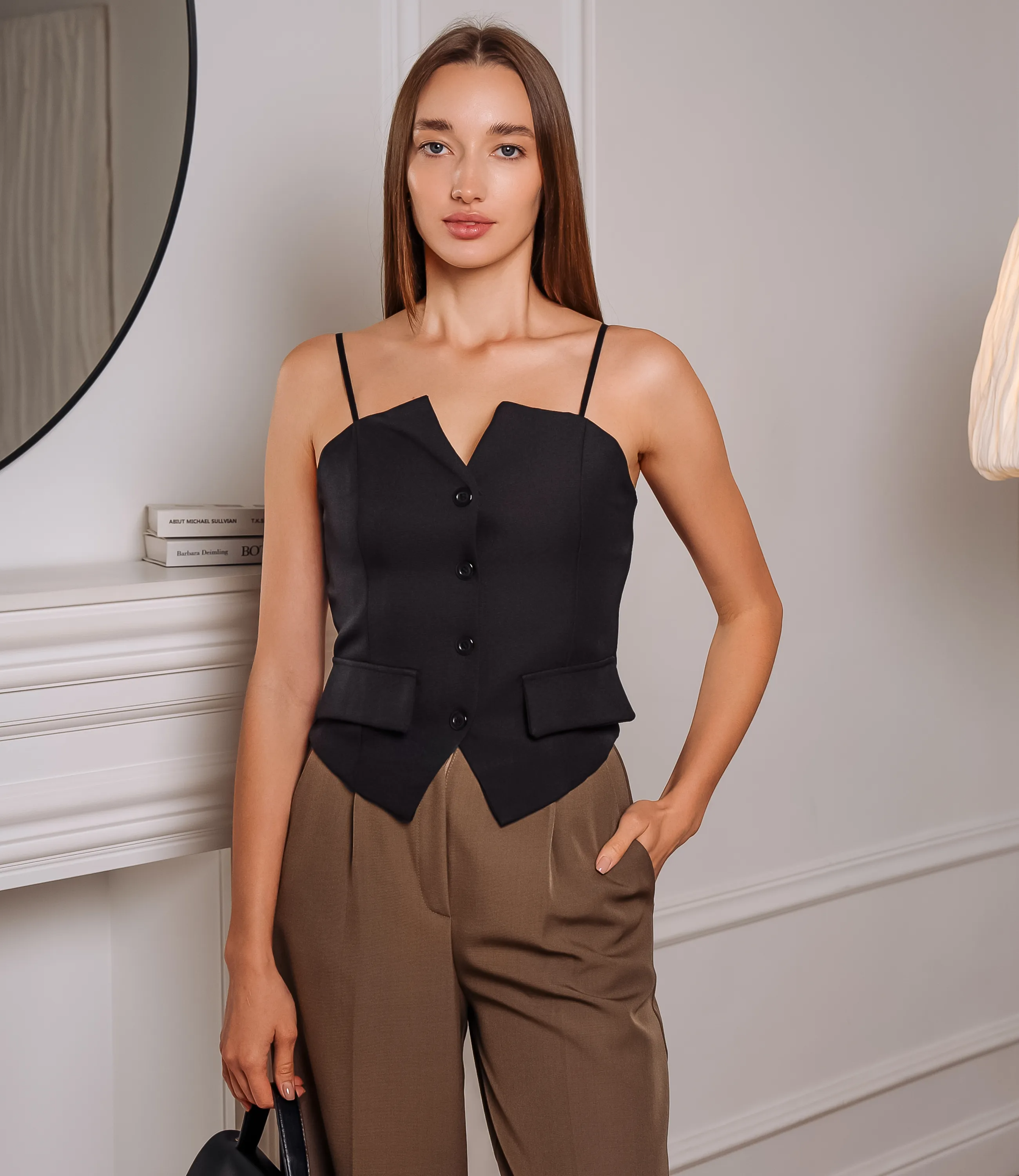 Топ — это безрукавная майка с круглым вырезом и уникальной сетчатой фактурой из крупной вязки. Топ приталенного кроя с чёткой конструкцией, повторяющий линии торса и заканчивающийся чуть ниже талии с симметричным V‑образным окончанием; верхняя часть имеет аккуратный угловатый вырез по центру и тонкие деликатные бретели, открывающие плечи; по переду расположена центральная планка с рядом пуговиц для застёжки, от которой отстроены вертикальные швы, формирующие стройный силуэт; по линии талии с обеих сторон пришиты небольшие прямоугольные клапаны, имитирующие карманы и визуально подчёркивающие талию; нижний край топа оформлен двумя симметричными клиньями, придающими геометричность линии низа. Состав ткани — 65% хлопка и 35% полиэстера — обеспечивает не только комфорт, но и долговечность. Хлопок придает майке мягкость, а полиэстер делает ее более устойчивой к деформациям и потере формы после стирок. Даже после многократных стирок майка сохранит свою первоначальную привлекательность и яркость цвета. Обратите внимание на разнообразие доступных цветов, которые полностью соответствуют фотографиям на сайте и позволят вашим клиентам выбрать идеальный вариант, соответствующий их индивидуальности. Мы также подготовили таблицу размеров на странице, чтобы каждая покупательница могла легко и без затруднений подобрать подходящий размер. Предложенная нами цена является привлекательной и адекватной для оптовых покупателей, что позволяет вам расширить ассортимент и привлечь больше клиентов. Дайте вашим покупательницам возможность быть стильными и уверенными в себе с этим великолепным топом! Не упустите шанс предложить им качественную и модную вещь, которая станет настоящим хитом в летнем гардеробе! Рост модели 168 см., 85-63-92.