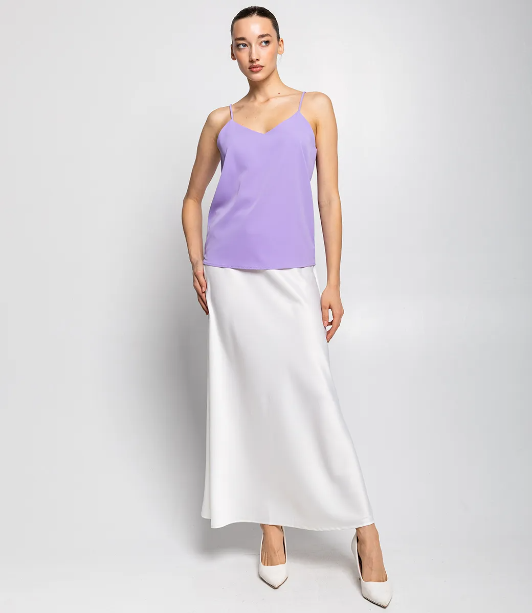 Нежный топ – отличный вариант для жаркой погоды. Он изготовлен из высококачественного материала, на ощупь напоминает шелк, поэтому дарит охлаждающий эффект и красиво струится. Топ на бретелях подойдет для создания повседневного, офисного и романтического образа. Его можно сочетать с юбкой, брюками, джинсами, шортами. Рост 168 см, 85-63-92.
