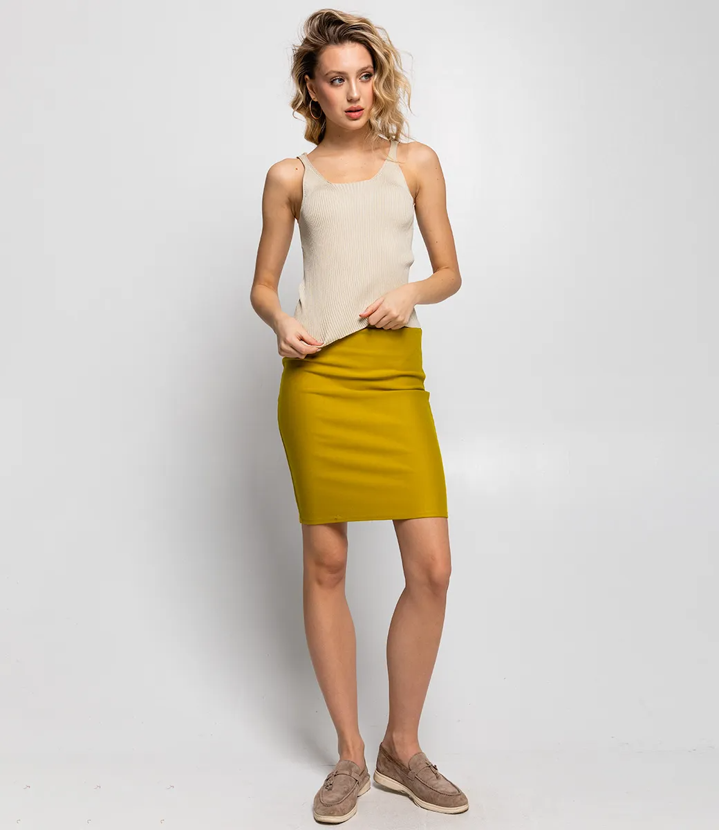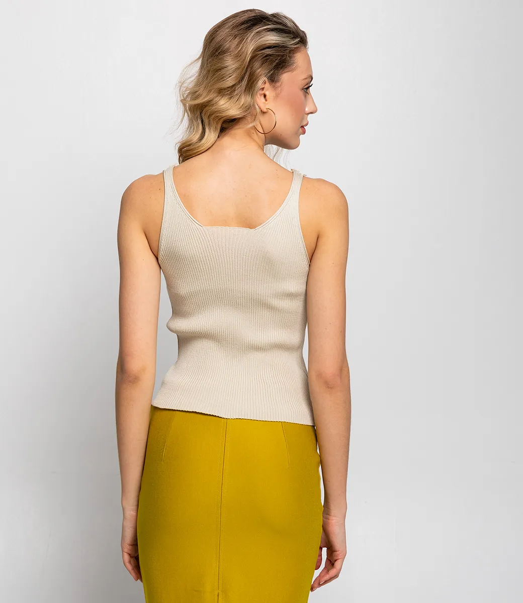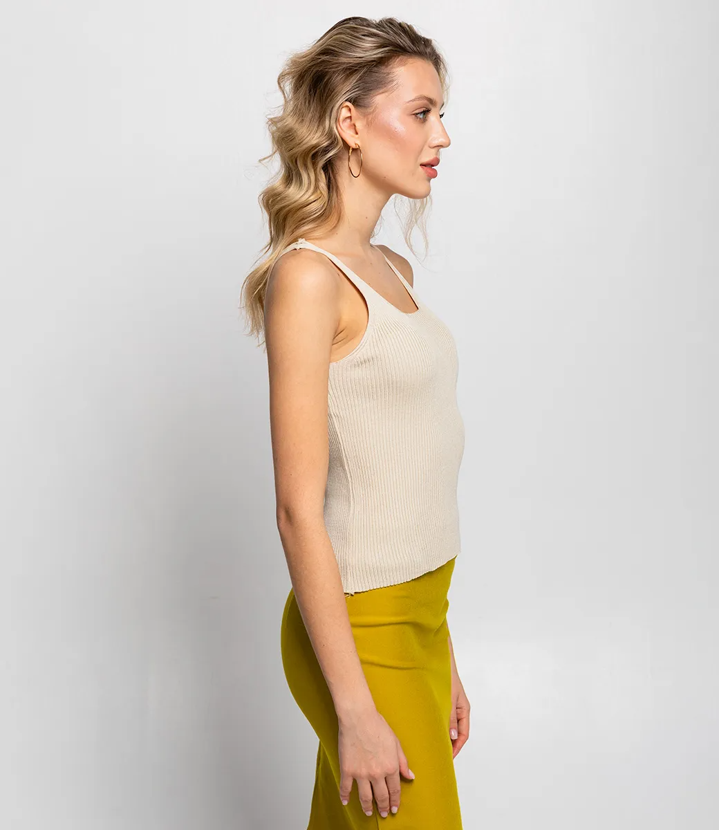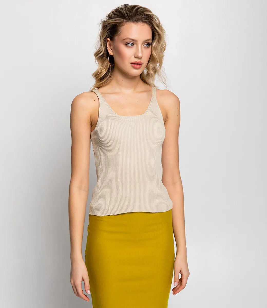 Трикотажный топ является замечательным трендом летнего сезона, который легко комбинировать с разными стилями. Рост модели: 174, параметры: 80-58-88.